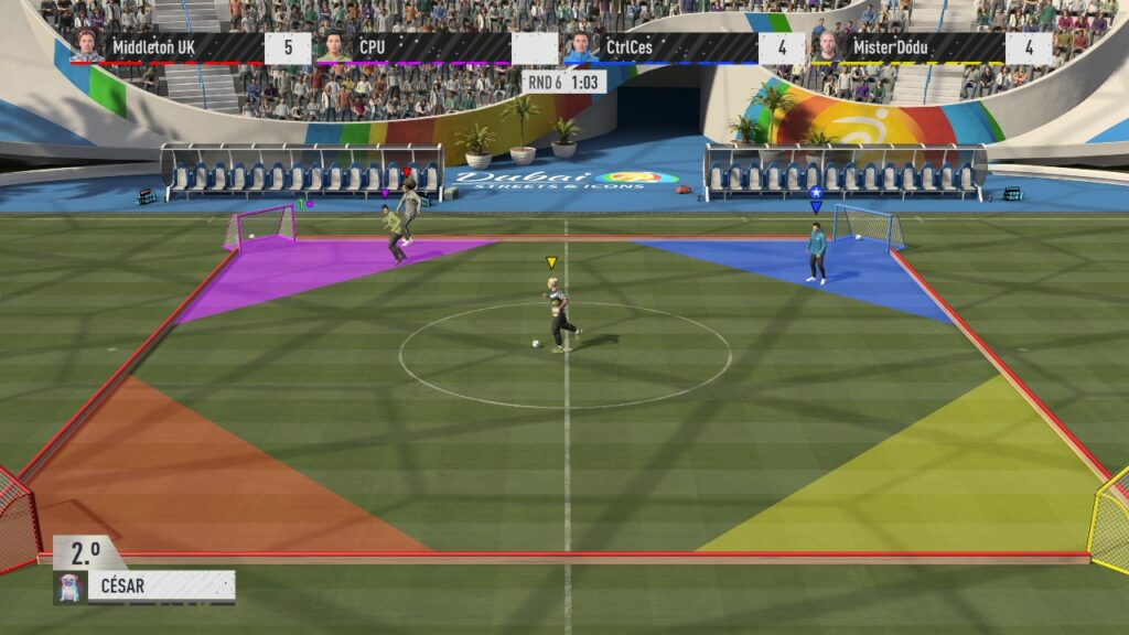 Volta también presenta cambios importantes, sobre todo porque ha dejado de ser solo un FIFA Street para adoptar modalidades más divertidas y relacionadas al Joga Bonito que tanta falta nos hace. De entrada, FIFA Volta requiere que siempre estés conectado, y si bien puedes jugar un partido con el CPU, la verdadera fiesta está en el modo arcade, donde una serie de mini juegos quieren sacar tu lado más competitivo. Y sí, es divertido al inicio jugar tenis con el balón de futbol, meter más goles en porterías de práctica o robar el balón a tus rivales en cualquier modalidad… pero tampoco se trata de un modo que te desafíe o que proponga cosas nuevas. Se siente más como un extra para pasar el rato de vez en cuando, pero que no supera el efecto de una buena reta en línea o codo a codo.