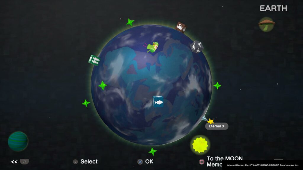 Katamari Damacy Reroll cuenta con un menú dividido en 3 mundos. Uno incluye todos los contenidos extras y ajustes; aquí podemos revisar el espacio y verificar los avances en la restauración del cielo y colocarnos algunos de los regalos de parte del rey, para personalizar a nuestro personaje. El segundo sirve para realizar partidas en cooperativo y medirnos en competencias por tiempo para ver quién crea la bola más grande. Por ultimo, está el mundo principal, donde escogemos las misiones, con la posibilidad de repetir cualquiera de ellas e intentar romper las marcas que dejamos.