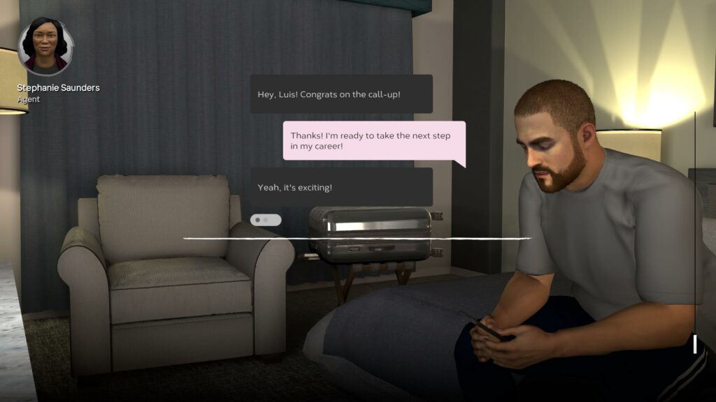 Por un lado, me parece genial poder emular el comportamiento de un jugador y su crecimiento desde Ligas Menores hasta alcanzar un primer juego en las Grandes Ligas: la sensación que se genera a través de ángulos y música cuando realizas tu primera participación en la MLB es bien lograda. Sin embargo, creo que aquí es donde las alabanzas pueden terminar: lamentablemente, el momento a momento de la simulación es extremadamente escueto, sin la calidad gráfica que identifica a los partidos de béisbol. De igual forma, la narrativa que se genera es mínima, con contactos ocasionales de tu agente preguntando por tu bienestar y reuniones con tu entrenador para evaluar tu desempeño.
