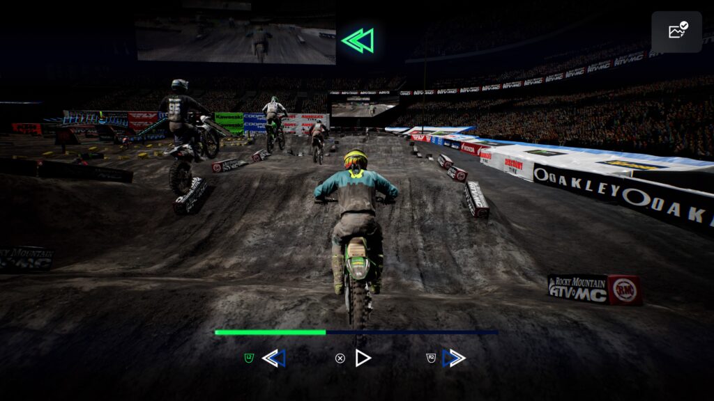 Como en los juegos anteriores, en Monster Energy Supercross – The Official Videogame 4 continua la posibilidad de regresar el tiempo para poder recuperar una mala curva, o una caída. Esta habilidad puede utilizarse 3 veces e incluso algunas veces extra con la única condición de no utilizarla una detrás de otra, pues tenemos que esperar a que se recarguen después de cada uso. A mí parecer esta es una mecánica que poco queda con el tono para un juego de competiciones, pero que probablemente usarás más de una vez gracias a la dificultad del título.