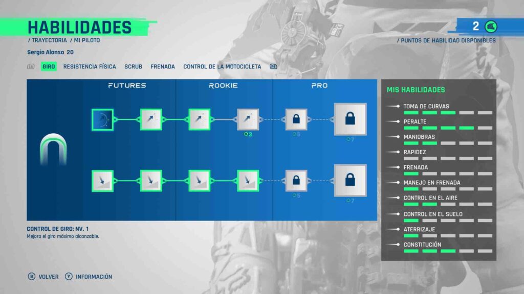 Este es un camino por 3 categorías donde debemos de coordinar las competiciones semanales, con pruebas intermedias, las cuales podemos intentar 3 veces antes de dejarlas pasar y perder valiosos puntos para mejorar nuestras habilidades. Estos puntos son muy importantes, ya que el juego cuenta con un árbol de habilidades centrado en las características de la moto, como mejorar el sistema de suspensión, frenos, marco, motor y más características que nos facilitaran los recorridos. Pareciera que estos cambios podrían dar poca ventaja, pero son piezas clave para convertirnos en campeones. A lo largo de las carreras, sin duda comenzaras en los últimos puestos pero al desbloquear cada una de las características extras, serán notorios los beneficios.