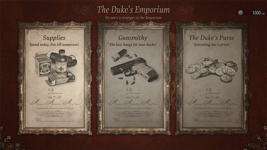 Resident Evil Village nos presenta a un muy peculiar personaje llamado Duque, un vendedor gordinflón que encontraremos en diferentes locaciones y pondrá a la venta todos sus productos a cambio de dinero. Éste lo conseguimos buscando en los escenarios, matando enemigos y hasta por montones si es que descubrimos los cofres y sus llaves esparcidos por el mapa, lo cual no es una tarea fácil. La otra manera de poder comprar los productos es encontrar los coleccionables que vendemos al mismo Duque, muchos de los cuales aparecen al derrotar a enemigos pesados y serán por los que más recibiremos dinero al cambiarlos en la tienda o al realizar misiones secundarias.