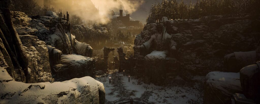 En esta ocasión, Resident Evil Village repite la cámara en primera persona y nos pone en un pequeño semimundo abierto repleto de hombres lobo que buscan devorarnos, pero en estos espacios hay casas que podemos explorar para buscar recursos o en algunos momentos escondernos. La manera en la que el juego nos va desmenuzando la historia se trata de avanzar entre 4 diferentes edificios, muy similar a la mansión Baker. Suena repetitivo pero para nada es así, pues cada una de estas edificaciones se centra algún tipo de tarea para poder vencer a sus dueños. Aquí es donde encontramos a la famosa Lady Dimitrescu que justo se trata de la inquilina del castillo que ya conocemos por tráileres y demos que se liberaron semanas atrás. Todos los edificios que visitamos nos exigirán resolución de puzzles, algunos más difíciles que otros, pero todos muy al estilo a los orígenes de esta increíble saga.