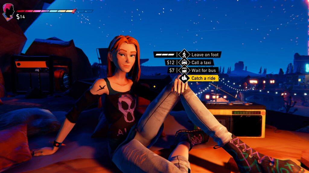 Estos escenarios narrativos, que duran entre 10 y 20 minutos, son el punto central de Road 96: en ellos exploras una ubicación en busca de comida, ayuda o dinero, platicas con gente, conoces más sobre el estado de Petria y una incipiente revolución y, sobre todo, investigas cómo conseguir acercarte más a la frontera. De alguna manera, la jugabilidad recuerda a Life is Strange, en el sentido en que puedes explorar a tu ritmo, hablar con personas para obtener información, obtener diferentes consecuencias según las respuestas que des… y varias cosas más. En general, entre más minucioso seas al explorar, tendrás más posibilidades de sobrevivir.