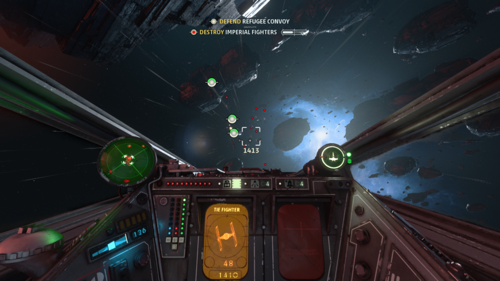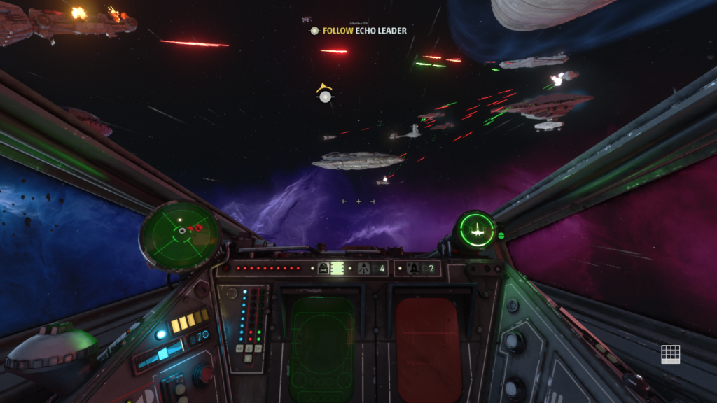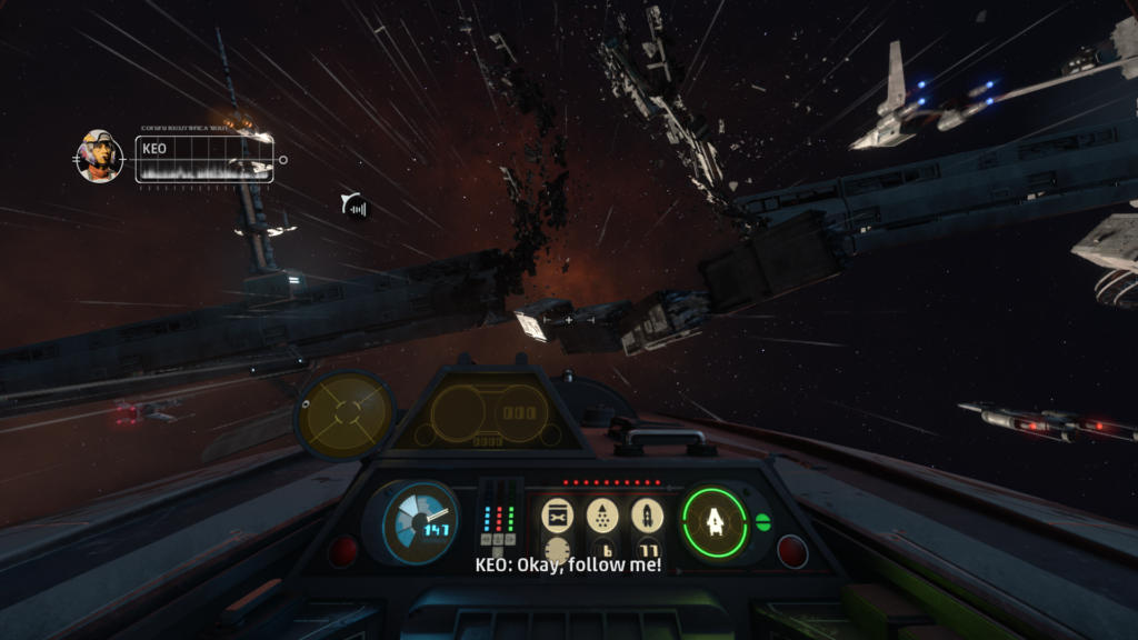 Sí, sí. Muy bonita la historia, pero, ¿Qué tal se juega Star Wars: Squadrons? Pues déjame decirte que es extremadamente divertido. Este título tomó apuntes de otros de navegación especial y creó una jugabilidad muy precisa que flota entre el arcade y la simulación. En la cabina tienes una gran variedad de opciones y controles a tu disposición, aunque afortunadamente el sistema es bastante intuitivo. Naturalmente tienes tu arma principal, pero también hay un apartado para misiles, sistemas de defensa, y robots de reparación. Además. puedes modificar los niveles de energía en tiempo real para priorizar la velocidad, el ataque y la defensa de tu nave. Algunos modelos incluso tienen aún más áreas de especialización, como la posibilidad de decidir en qué parte quieres los escudos (al frente o detrás). Por si te parece poco, ambos frentes tienen 4 naves diferentes, cada una de las cuales cuenta con diferentes atributos: por ejemplo, el A-Wing es más veloz que el X-Wing, aunque tiene menos resistencia. Aunque manejar tantos sistemas al mismo tiempo que intentas escapar de un cohete enemigo y persigues a alguien suena muy complicado, la realidad es que el equipo desarrollador hizo un gran trabajo combinando el arcade con la simulación para ofrecerte libertad de maniobra para que te enfoques en lo que realmente importa: destruir a la nave que tienes en frente. En cuestión de minutos, te sentirás como en casa dentro de la cabina.