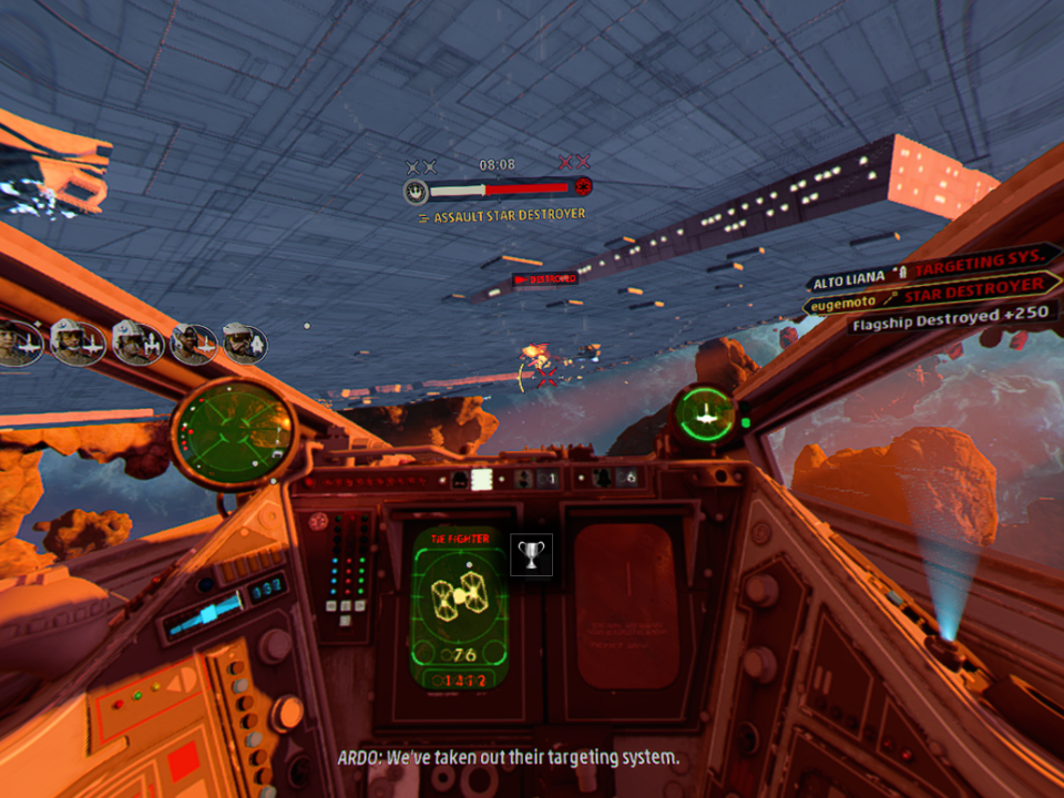 Fuera de eso, y aunque no lo parezca, la experiencia se puede mejorar. Sí, el título está bien para jugarlo en una consola y un televisor. Pero disfrutarlo en realidad virtual es… mágico. Estar, de verdad, dentro de la cabina de un X-Wing o un TIE Fighter, poder voltear a los lados para ver quién te está siguiendo u observar cómo explota una nave enemiga es una experiencia inigualable. Y si de verdad eres fanático del género, incluso puedes conectar un HOTAS que reemplaza el control por una palanca de control de vuelo y así obtener la simulación definitiva.