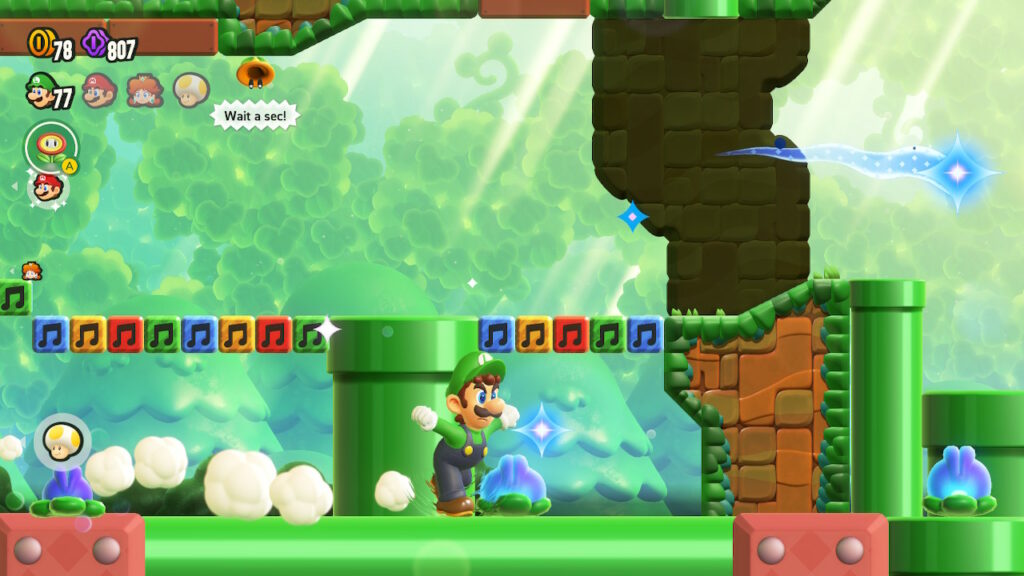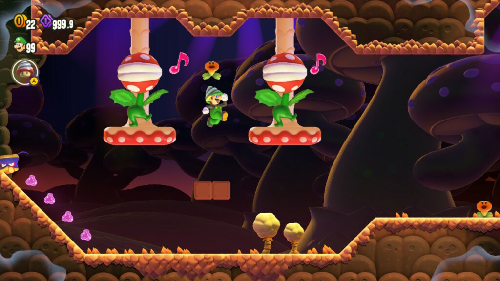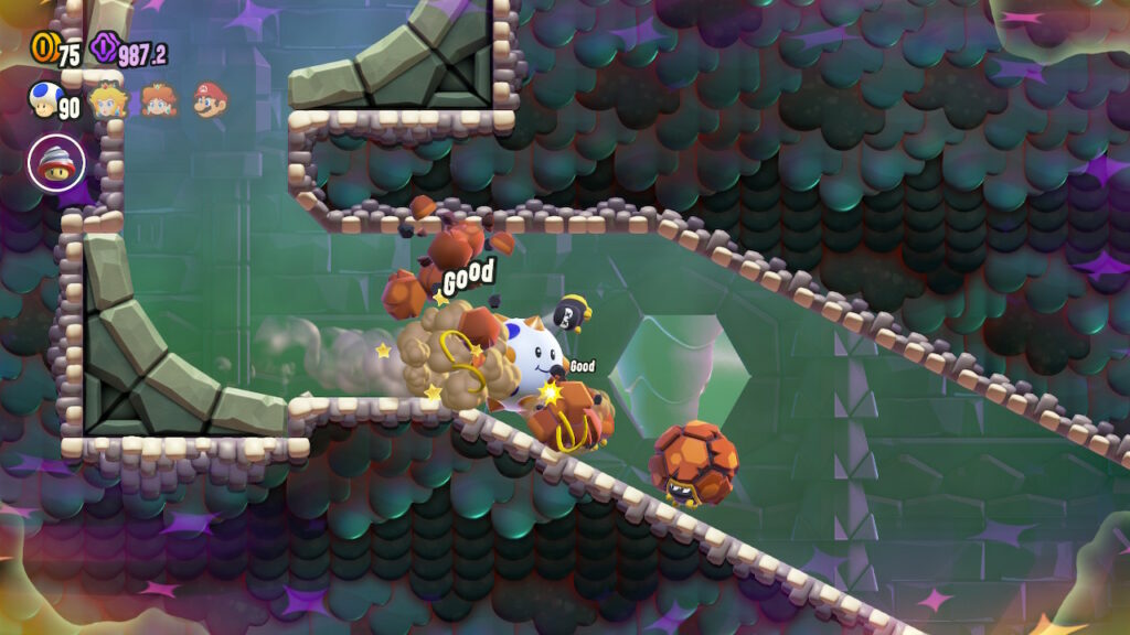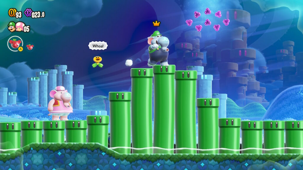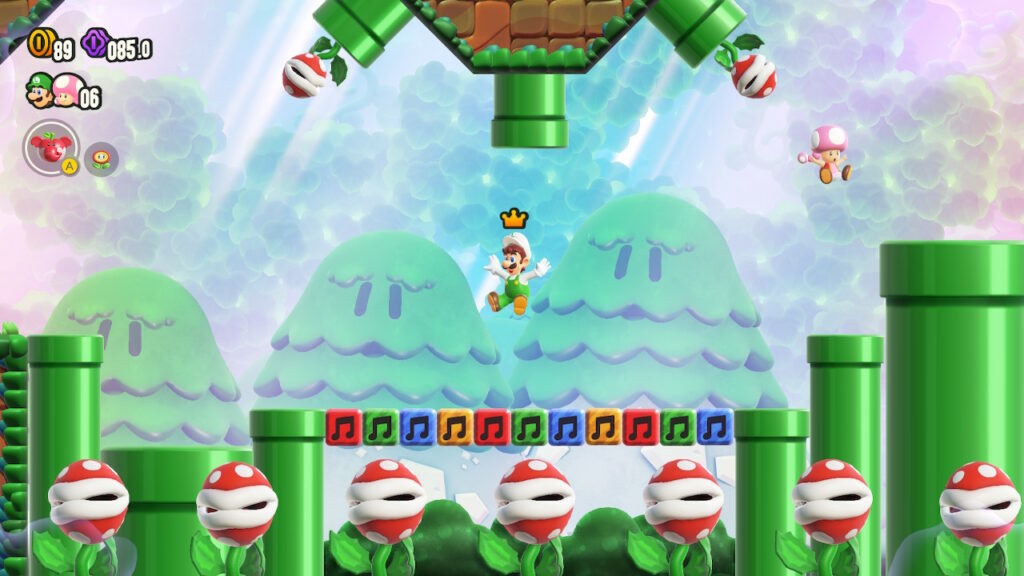 El multijugador local es similar a lo que verías en un juego como New Super Mario Bros U, con la implementación de cambios como la eliminación de colisión para hacer de la experiencia menos competitiva y más tranquila: puede que extrañes esto, pero creo que lleva a una aventura más enfocada a que todos puedan disfrutar de la jugabilidad y las locuras del Reino Flor sin que esta alegría venga de la desgracia de otros.