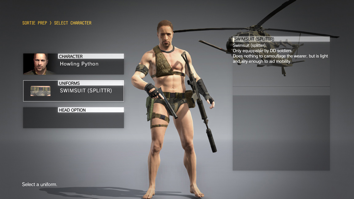 Esta consiste en trajes de baño para vestir a tu equipo con los más modernos outfits playeros y enfrentar de una manera más cool a tus enemigos en Metal Gear Solid V. Lamentablemente, estos trajes de baño solo estarán disponibles en el modo en línea, por lo que no podrán ser usados en la Mother Base.