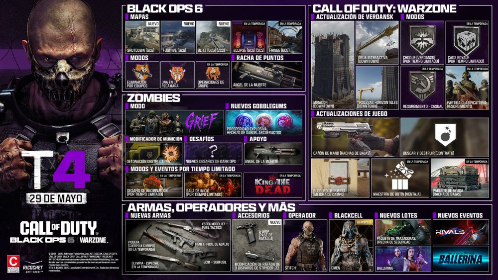 Finalmente, la temporada trae eventos temáticos como Ballerina, que ofrece recompensas inspiradas en la película, y Rivals, centrado en la narrativa de Stitch y Adler. También regresan desafíos como King of the Dead y Master of Grief. En resumen, esta Temporada 4 amplía el universo de Call of Duty con nuevas mecánicas, mapas, narrativa y contenido visual único.