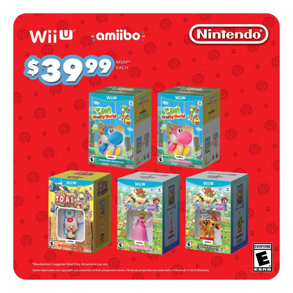 Por otro lado, Nintendo relanzará juegos para Wii U, con la inclusión de un amiibo, los juegos serán: Yoshi’s Woolly World (amiibo de Yoshi de estambre azul o rosa), Captain Toad (amiibo de Toad) y Mario Party 10 (amiibo de Peach o Bowser). Todos ellos con un costo de 40 dólares y que estarán disponibles a partir del 9 de septiembre.