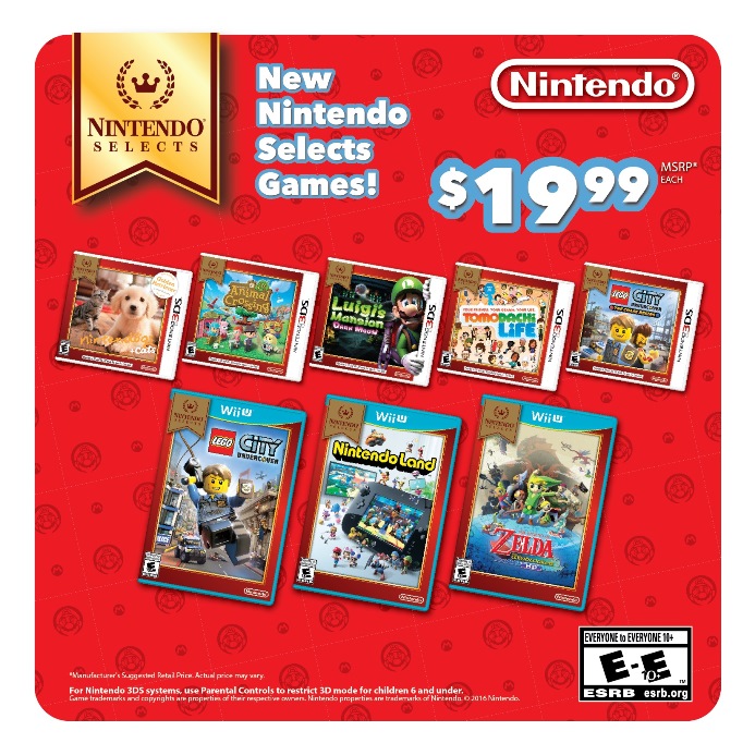 Serán 8 los juegos que pronto estarán disponibles a partir del 28 de agosto a un precio de 20 dólares, esto como parte de la línea Nintendo Selects, los títulos serán: The Legend of Zelda: Wind Waker HD, Lego City Undercover, Nintendo Land; para Wii U.