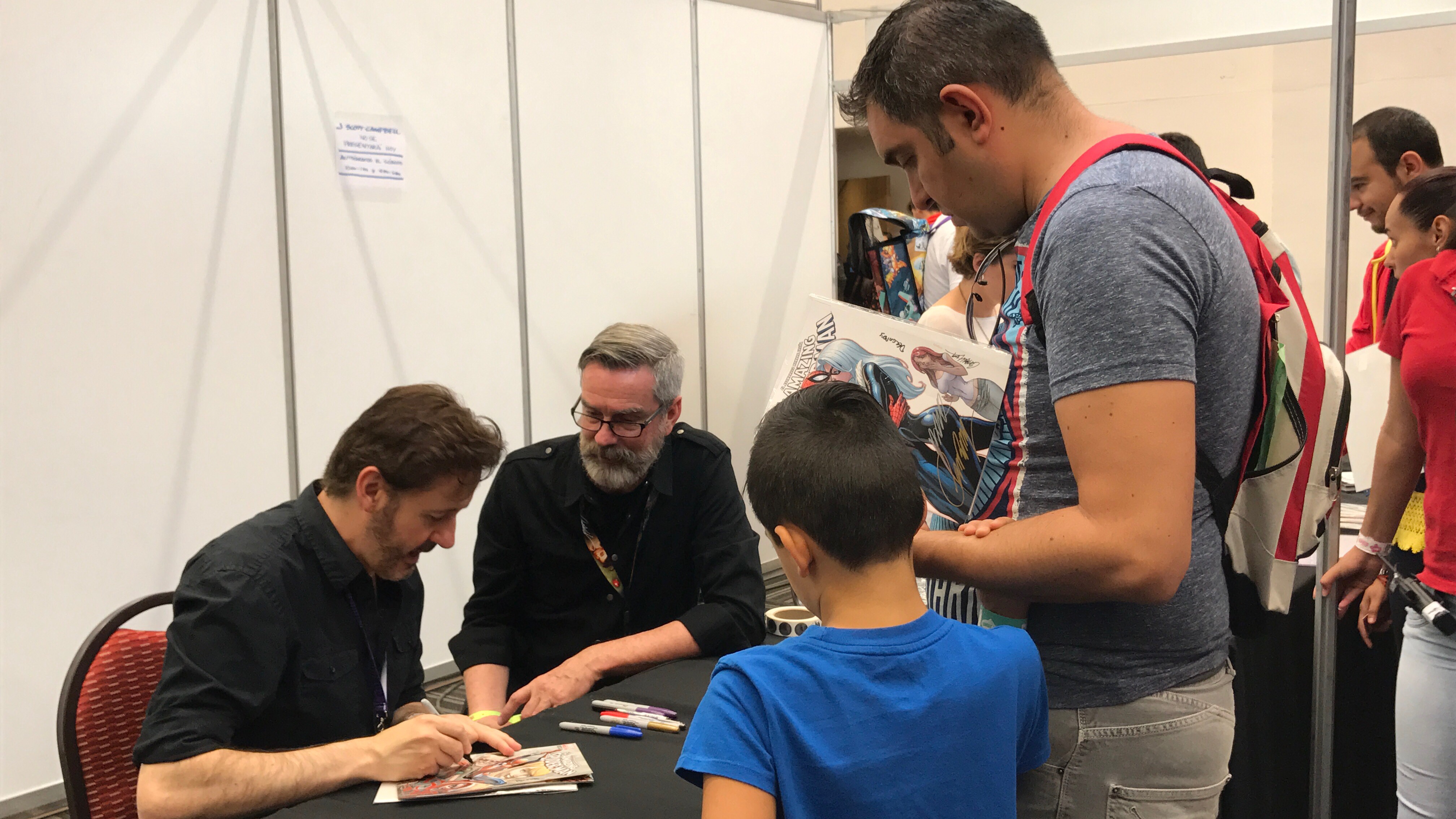 Mark Waid fue la estrella del primer día, pues en conjunto con el resto del equipo creativo de Champions, Humberto Ramos, Edgar Delgado y Víctor Olazaba, abrieron las conferencias en el Teatro Metropolitano para discutir un poco su más reciente trabajo en Marvel. Una plática que pondría sobre la mesa los tópicos más comunes en las conferencias de Conque; cada platica se volvió un viaje personal entre los artistas y el público, encontrando similitudes entre ambos que van más allá del dibujo y los globos de texto.