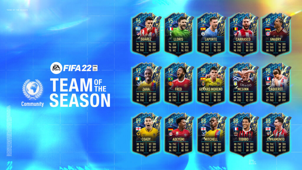 EA SPORTS reveló hoy al Equipo de la Temporada de la Comunidad (TOTS por sus siglas en inglés) de FIFA 22. El mismo incluye grandes nombres como Luis Suarez, Serge Gnabry, Aymeric Laporte y muchos, muchos más. El TOTS de FIFA 22 elegido por la comunidad celebra lo mejor de la temporada y a quienes constantemente entregaron todo por sus equipos.