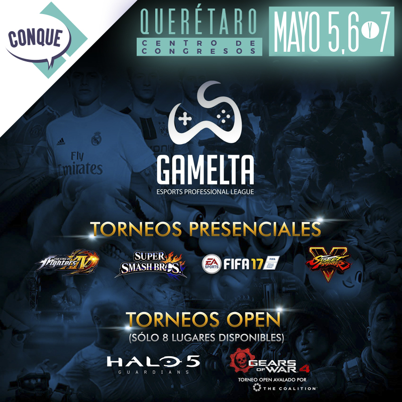Gamelta será la encargada de producir y operar todo el contenido relacionado con eSports dentro de Conque, llevando a cabo las finales de su temporada 2017 los días 5, 6 y 7 de mayo. Con una bolsa de más de 100 mil pesos en premios, las finales principales serán de Halo 5: Guardians, League of Legends y Overwatch.