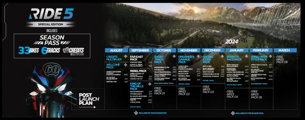 Los motociclistas que quieran construir el garaje de sus sueños pueden adquirir el Pase de Temporada de RIDE 5. Con 33 motos nuevas, seis circuitos adicionales y un multiplicador de créditos, los jugadores que adquieran el Pase de Temporada tendrán acceso a un total de 270 motos diferentes y más de 40 circuitos. El Pase de Temporada de RIDE 5 está disponible actualmente en tiendas digitales por 39,99 $. Todos los contenidos posteriores al lanzamiento de RIDE 5 a través de su Pase de Temporada también pueden adquirirse individualmente.