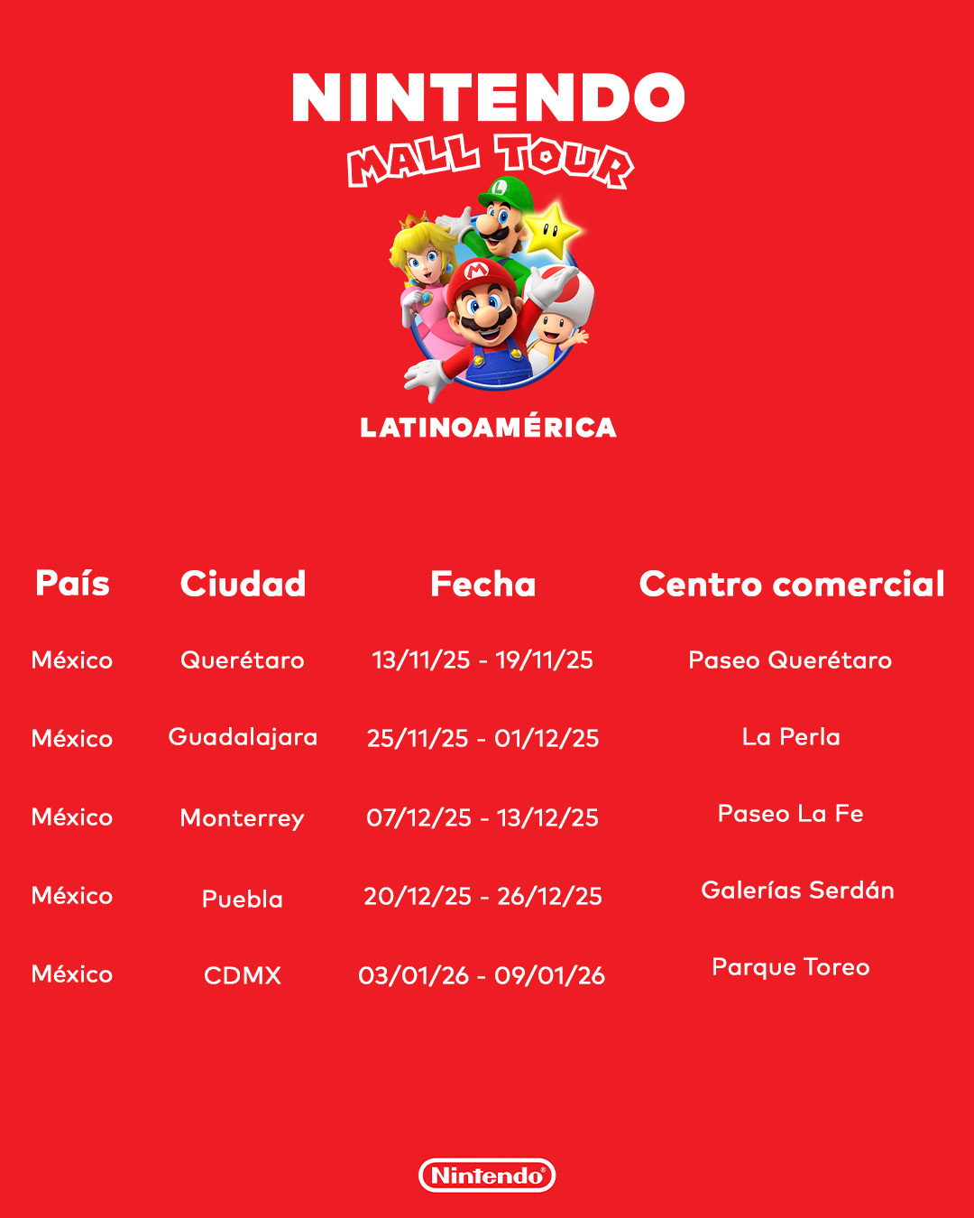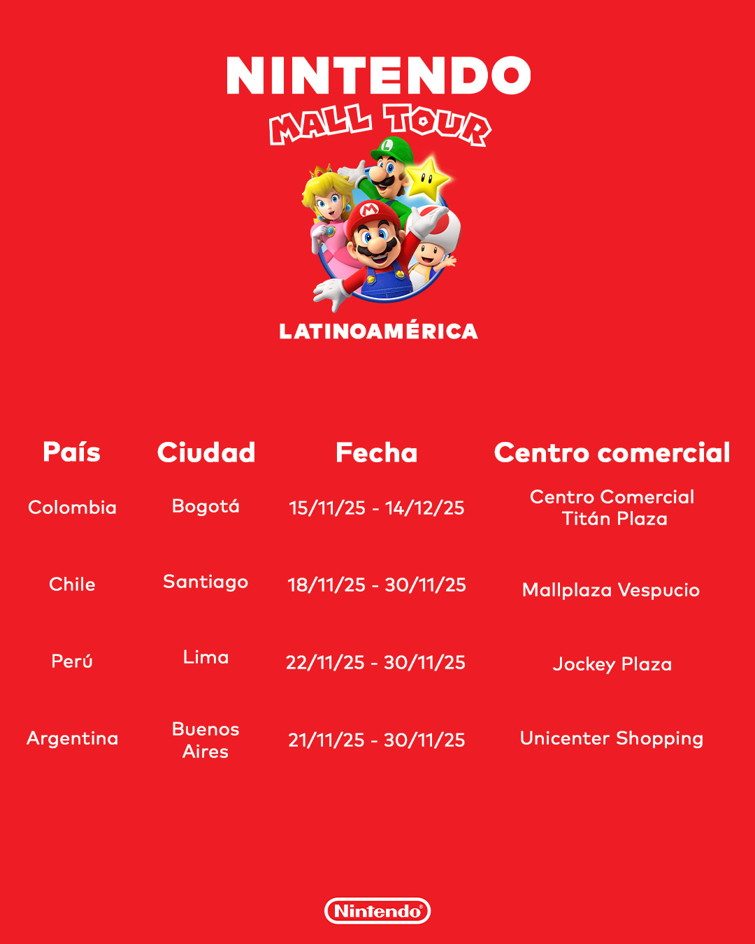 Nintendo anunció el Nintendo Mall Tour Latinoamérica, una gira especial que recorrerá seis países de la región para celebrar la temporada navideña con actividades gratuitas para toda la familia. Desde noviembre de 2025 y hasta abril de 2026, los fans podrán disfrutar de demos exclusivas, regalos y sesiones de fotos con Mario en 14 centros comerciales seleccionados.