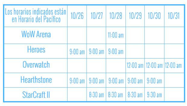 Los jugadores élite de eSports de todo el mundo viajarán a Estados Unidos el próximo mes para competir en la Semana de apertura de BlizzCon, con la esperanza de posicionarse para la victoria en el escenario de BlizzCon el 4 y 5 de noviembre. Además de las primeras rondas de la competencia de World of Warcraft Arena, Heroes of the Storm, Hearthstone y StarCraft II, la Semana de apertura de este año presentará un grupo inicial de combates en el escenario de la copa mundial de Overwatch, una exhibición que enfrenta a naciones y regiones entre sí.
