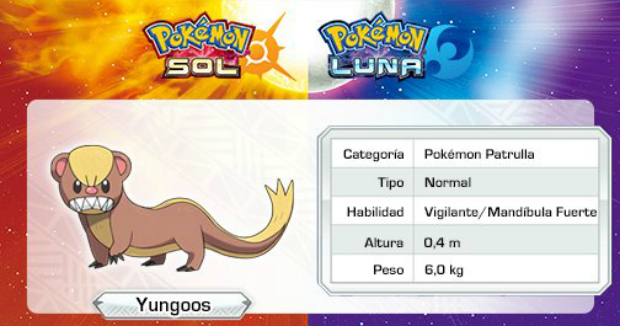 Pokemon Sun y Moon ahora incluirá a Yungoos, este es de tipo Normal y entre sus habilidades incluye Mandíbula Fuerte y otra que parecer ser completamente nueva. También está Pikipek, el cual fue revelado en una batalla, este se trata del tipo Normal y Volador, conoce a la perfección las habilidades de Vista Lince y Encadenado. Por último, pero no menos importante está Grubbin, es de tipo Bicho con habilidad Enjambre.