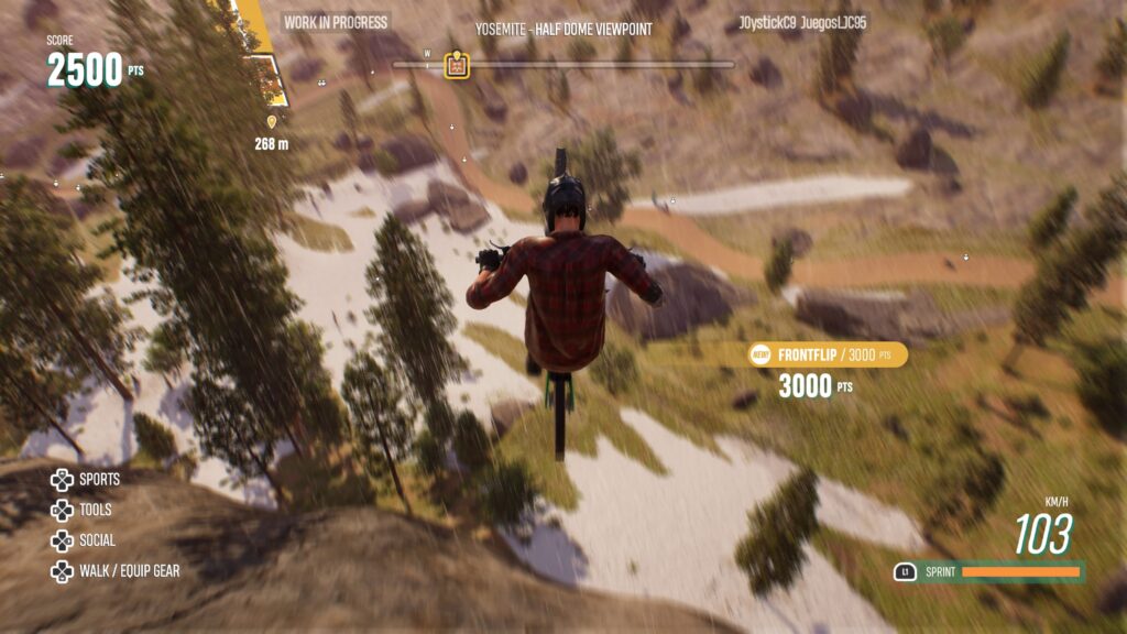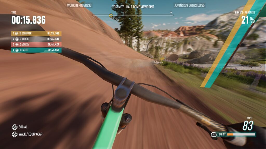 Como mencioné, el mundo de Riders Republic está compuesto por una combinación de parques nacionales estadounidenses, como Yosemite, Zion o el Parque Nacional de la Secuoyas. Aunque estos bellos parques están separados considerablemente por la distancia en el mundo real, Ubisoft, en mi opinión, acertó al unirlos en un solo espacio que logra cohesionar un mundo fluido, lo cual demuestra ser útil en algunas de las mejores competencias.