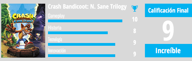 Crash Bandicoot: N. Sane Trilogy ha envejecido como pocos títulos de la industria y el trabajo de Vicarious Visions no hace más que colocarlo entre las mejores experiencias plataformeras de la actual generación de consolas. En un año que tendrá de vuelta a Sonic y Mario en aventuras 3D, Crash nos recuerda que sigue vigente y parece hacernos la promesa de volver en forma de pura y sana nostalgia noventera… sí, te estamos viento a ti CTR.