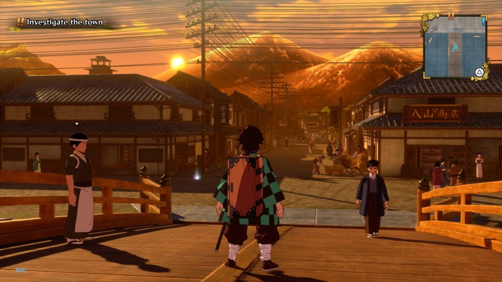 Para ir avanzando la narrativa de manera orgánica, el título te coloca en secciones de exploración libre, en las que Tanjiro y otros personajes tienen que investigar sucesos y hablar con gente para impulsar la historia. Realmente, cada uno de estos escenarios, desde los bosques hasta las ciudades y los interiores de dojos, están bastante bien logrados, considerando que no hay mucho material fuente para volverlos realidad. La iluminación es particularmente buena y los ángulos de cámara hacen la experiencia un poco dinámica, pero el problema es lo que realmente haces durante estos momentos.