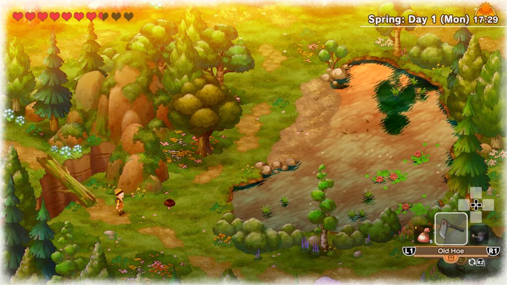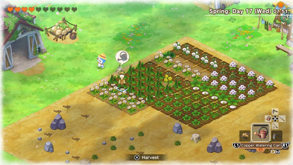 Bueno, pero entonces ¿este juego se juega igual que la precuela? No realmente. Parece que la desarrolladora escuchó a la comunidad, pues hay varios ajustes que corrigen la mayoría de los problemas que la gente tuvo con Doraemon: Story of Seasons. Para empezar, ahora los días son más largos: en lugar de que un minuto dentro de la partida dure un segundo, ahora dura dos. Y aunque esto parezca poco, al final todos estos segundos se suman y hacen que cada estación en general dure mucho más. Por ejemplo, a las 15 horas de juego hice un comparativo: en la nueva entrega seguía en el día 22 de primavera, mientras que en la pasada ya estaba en otoño.