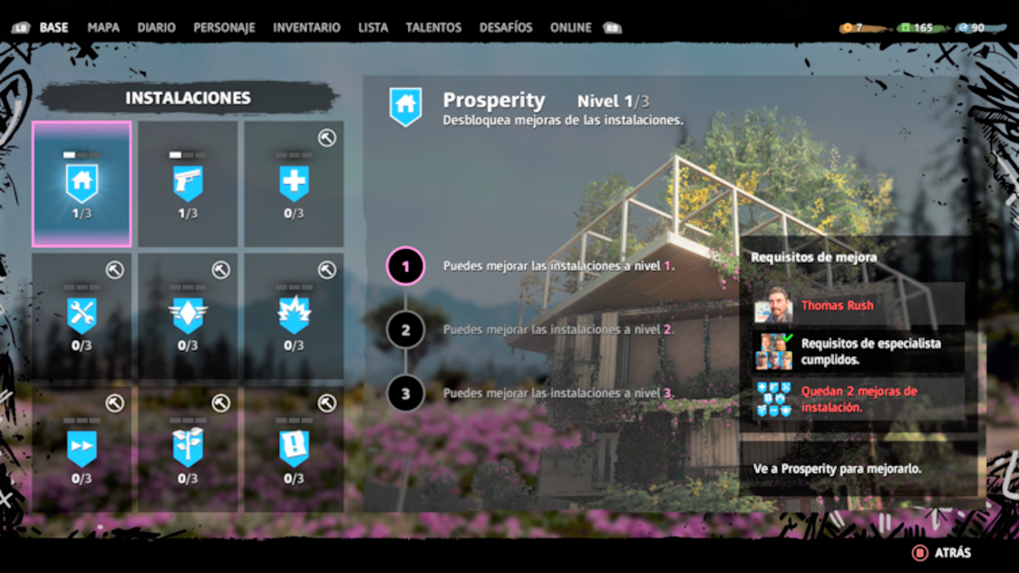 Todas cuentan con tres niveles que podremos subir para conseguir mejoras en cada uno de sus apartados y con esto desbloquear mejoras para la base en general. La manera de conseguirlo todo esto es mediante los requisitos que nos presentan y que terminan promoviendo la exploración y la recolección de etanol, el combustible del mundo post-apocalíptico que se puede conseguir de muchas formas distintas.