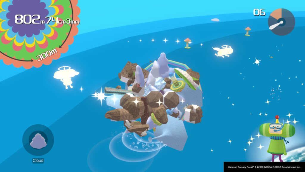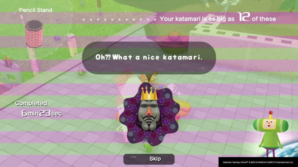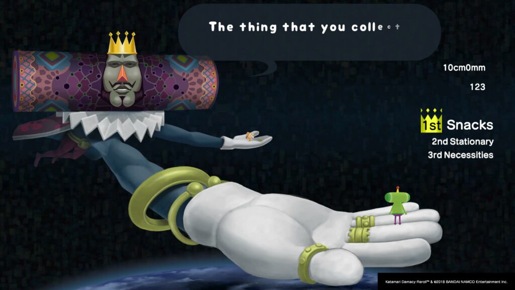 Katamari Damacy Reroll únicamente cuenta con estas 2 opciones de juego, y déjame decirte que no necesita más. Pasar de una misión de crear una esfera de cierto tamaño a otra de recolectar algo en específico deja una sensación de no estar repitiendo la misma acción después de varias horas.