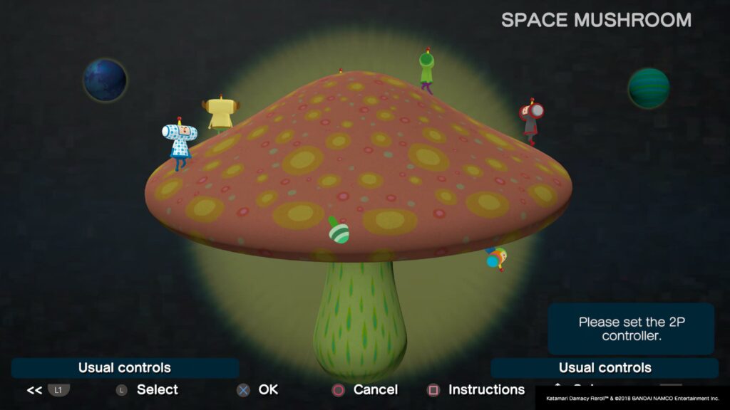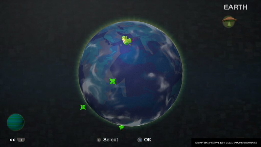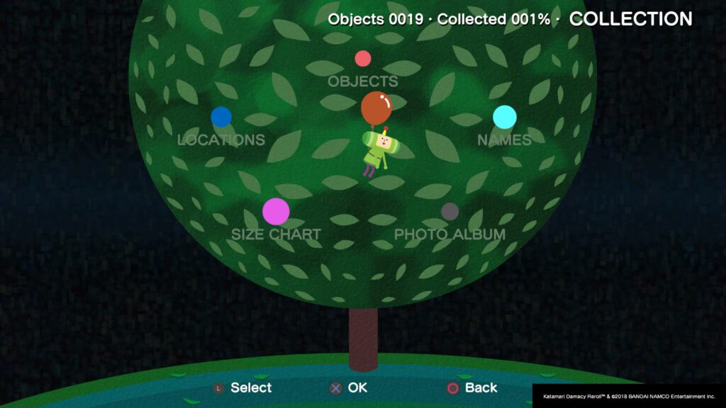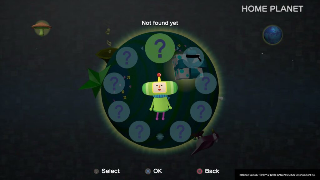 Katamari Damacy Reroll cuenta con un menú dividido en 3 mundos. Uno incluye todos los contenidos extras y ajustes; aquí podemos revisar el espacio y verificar los avances en la restauración del cielo y colocarnos algunos de los regalos de parte del rey, para personalizar a nuestro personaje. El segundo sirve para realizar partidas en cooperativo y medirnos en competencias por tiempo para ver quién crea la bola más grande. Por ultimo, está el mundo principal, donde escogemos las misiones, con la posibilidad de repetir cualquiera de ellas e intentar romper las marcas que dejamos.