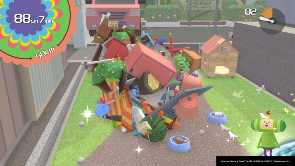 El juego cuenta con alrededor de 20 niveles. Lamentablemente estos se reparten únicamente en 2 locaciones, una diseñada para dimensiones pequeñas, dentro de una casa con la posibilidad de salir al jardín; y la segunda con espacios abiertos para llevar a nuestro katamari a tamaño Kaijū. Debo destacar que en esta última locación me llegó a suceder que quedé atrapado entre árboles, marcos o paredes, perdiendo valiosos minutos y, peor, la misión. Afortunadamente, esto sucede muy pocas veces.