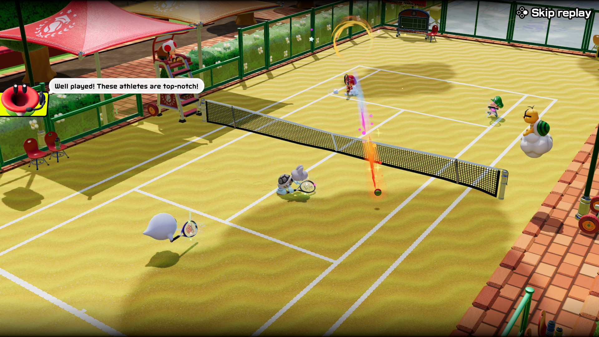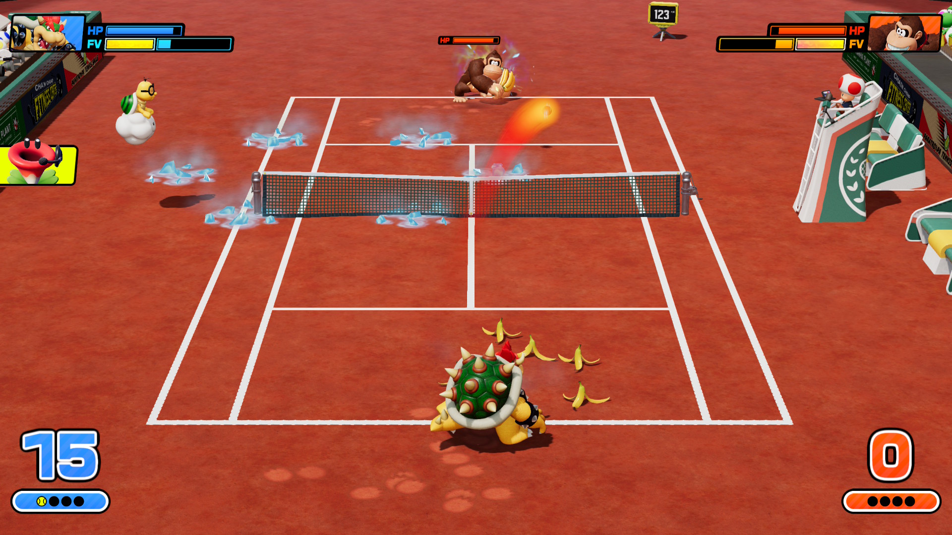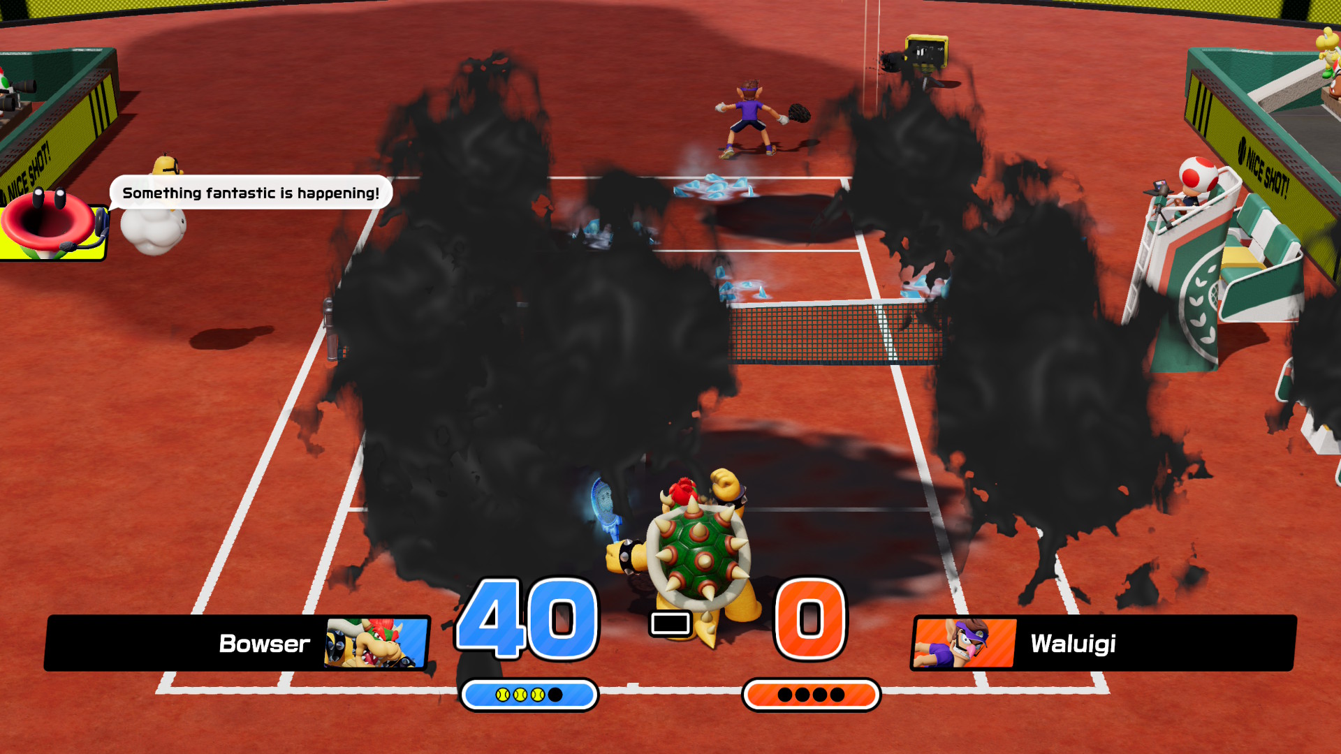 La jugabilidad fundamental en Mario Tennis Aces de 2017 es la mejor que ha tenido la franquicia, y afortunadamente, se mantiene aquí más o menos igual. Tienes muchos tiros, cada uno con una función diferente. Primero están los tiros básicos: top spin, para hacer que la bola gire rápido y alto; plano, para que la bola vaya derecho, rápido y a las esquinas; y slice, para que la bola vaya lento y te permita posicionarte. También están los tiros avanzados: globo, para levantar la bola por encima del oponente si está muy pegado a la red; y dejadito, para hacer que la bola apenas pase la red si es que el oponente está muy lejos. De igual manera,puedes modificar ligeramente su comportamiento, dejando apretado el botón para pegarlos más a las esquinas, o apretándolo dos veces para que vayan más rápido.