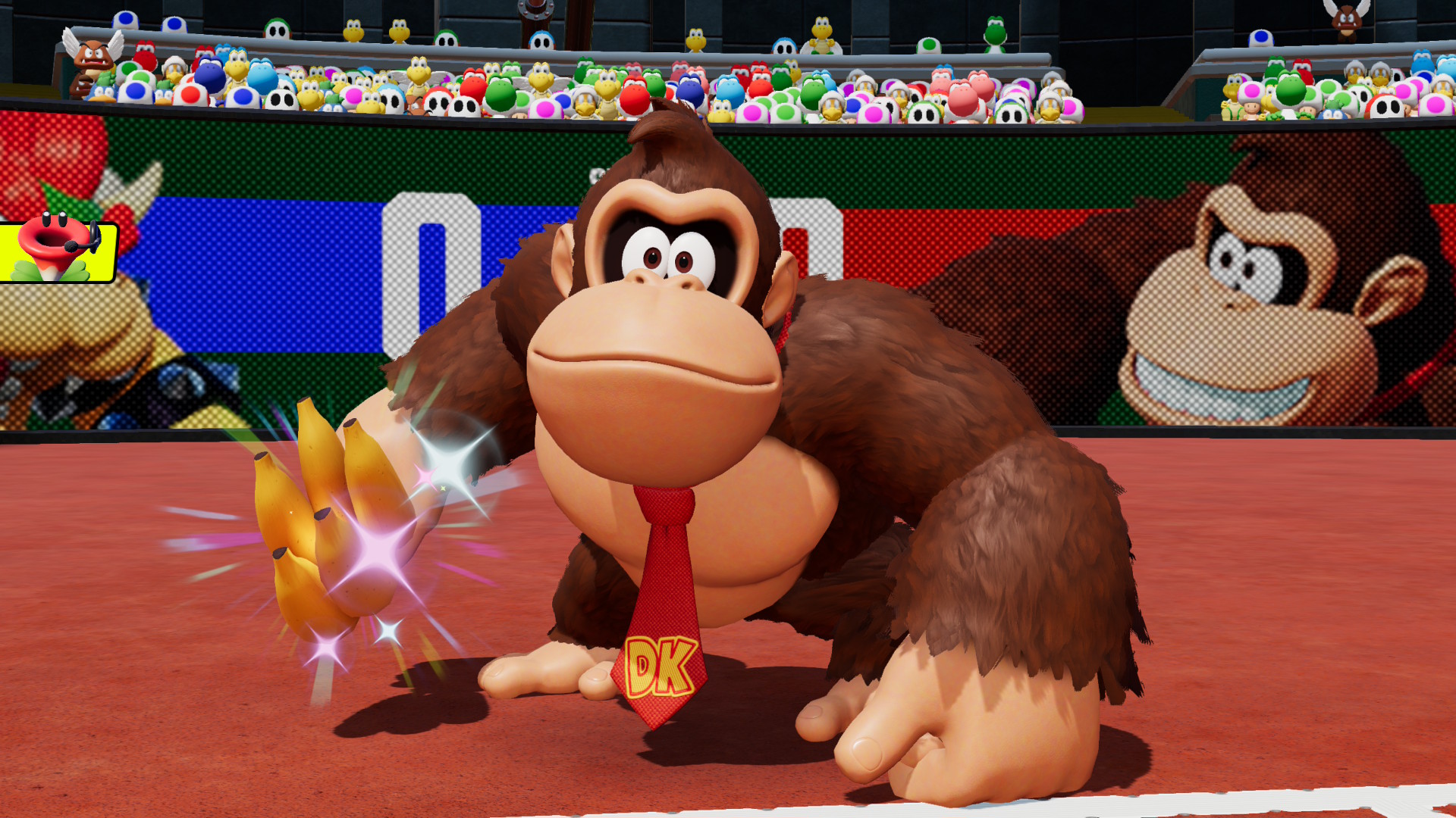 La buena noticia es que los demás modos de juego sí son divertidos y ofrecen bastante variedad, para que puedas completarlos en solitario o con amigos. Primero, obviamente está el modo torneo, que puede jugarse en solitario o en parejas, y que tiene tres copas que van aumentando en tema de dificultad. Después están las tres torres de los retos, que te ponen 10 retos seguidos que debes completar sin perder más de tres veces. Estos retos pueden ir desde utilizar tres personajes pequeños para derrotar a uno grande, regresar la bola al enemigo evitando que pueda tocarla, hacer puntos al pasar la bola a través de aros de oro, o jugar en un partido en el que todos usan raquetas furor todo el tiempo. E incluso si te pasas las tres torres, hay un desafío extra con más de 100 retos que pondrán a prueba tus habilidades.