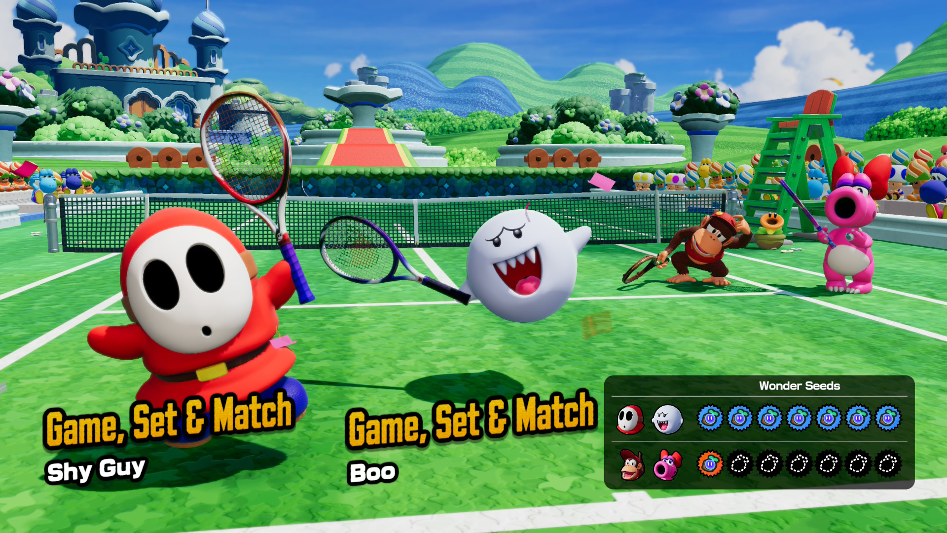 Lamentablemente, Mario Tennis Fever simplificó la oferta de manera dramática: ahora solo puedes jugar partidos sencillos de 7 puntos, con raquetas especiales o sin ellas. Y después del partido, tu ranking se actualiza subiendo o bajando de categoría según una puntuación. Y eso todo. Ah, y tampoco puedes jugar dobles en línea clasificatorios si estás jugando con un amigo en la misma consola, mientras que en Aces sí se podía.