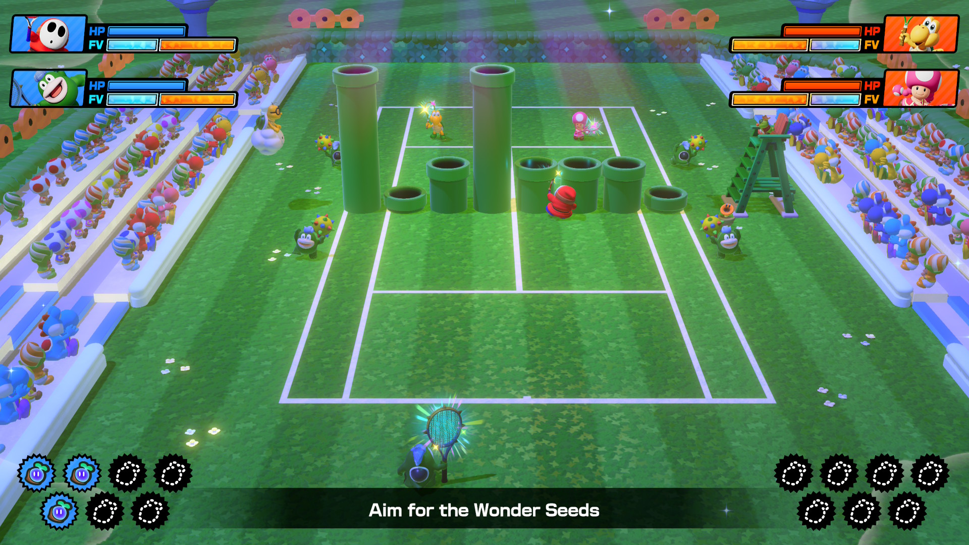 Si esto no te parece suficiente, también hay partidos en canchas especiales que cambian las reglas. Por ejemplo, la cancha en el bosque hace que Plantas Piraña añadan o eliminen porciones de los dos lados de la cancha constantemente. La cancha de pinball hace que las bolas reboten todo el tiempo y se añadan otros efectos. La fábrica de raquetas hace que distintas raquetas furor aparezcan aleatoriamente por todo el campo. T la cancha maravilla está sacada de Mario Wonder, en el que el objetivo es recoger semillas, pero de vez en cuando aparece una Flor Maravilla que causa efectos tan locos como en el reciente plataformero de Mario. Finalmente, está el modo en el que usas el Joy-Con como raqueta real, que si bien no es nada preciso, es divertido para jugar con niños o con invitados.