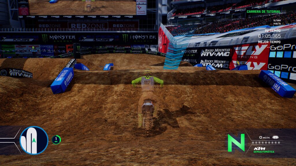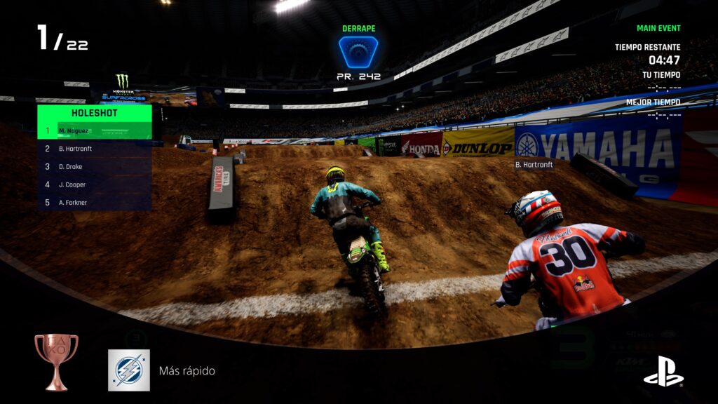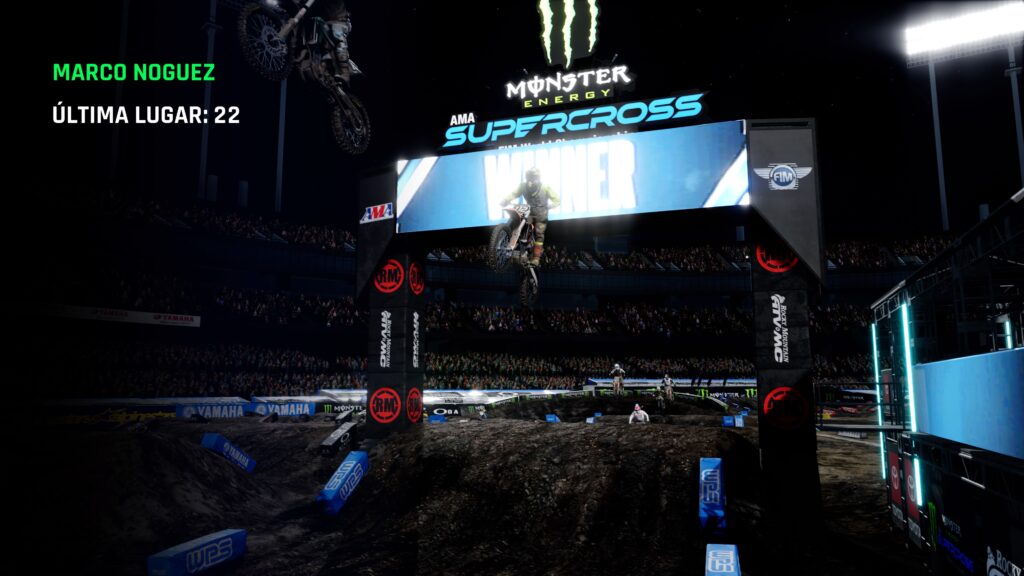 Y si te preguntas ¿En qué momento nos subimos a la moto? Es justo después de esto, y déjame decirte que pocos juegos logran una sensación en los controles como lo hace Monster Energy Supercross – The Official Videogame 4, ya que las físicas del juego están pulidas a la perfección. Muy rápido podemos notar lo fiel que son los movimientos de la moto en la vida real, con el uso de las palancas, y no solo para la dirección sobre el plano, sino también para la posición del cuerpo. El juego cuenta con una de las mejores físicas para juegos de moto del mercado, y debido a lo rápido que son las competiciones, generalmente los controles se sienten sumamente responsivos pero la curva de aprendizaje es muy complicada. La estrategia se encuentra en equilibrar a nuestro personaje con cada brinco para poder tomar de la mejor manera cada rampa o curva. Y es que junto con la inmersión que ofrece el control DualSense del PS5 con el que se realizó este análisis, esta es una experiencia sin igual en la que sufriremos de muchas caídas para poder dominarlo, pero una sensación increíble en los dedos a cada salto.
