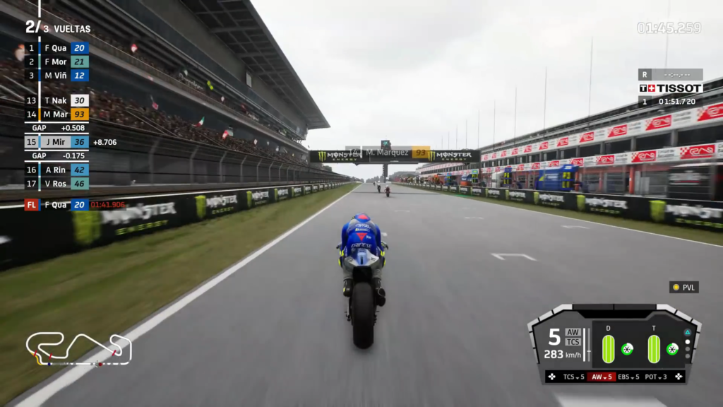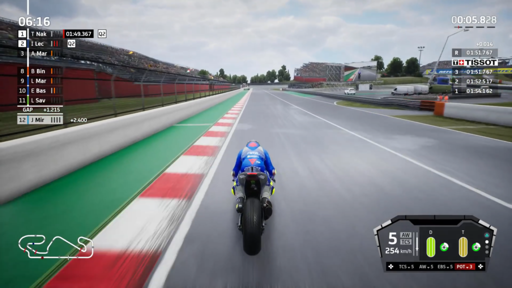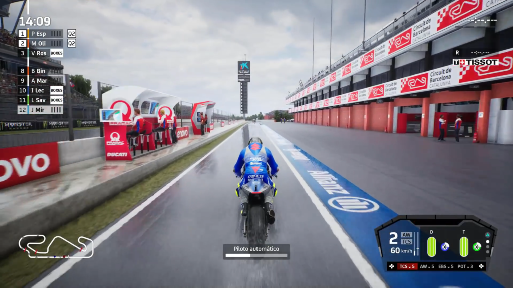 Las físicas con la que cuenta Moto GP21 son lo más realistas posible. En cada vuelta se puede sentir lo pulido que se encuentran los controles y lo bien que se siente cada moto dependiendo de la pista que recorramos. En mi caso pude probar el juego en el PS5 y como lo han hecho los últimos títulos que llegaron a la consola, la adaptación de los gatillos del DualSense y la vibración característica son un añadido que le dan un plus a la experiencia para la consola. Además, el juego cuenta con todas las pistas existentes en la competición, todas muy fieles a sus versiones reales y explotando las características de la nueva generación el juego se ve muy bien. Cabe resaltar lo detallado de las pistas, con condiciones diferentes del clima, en las que además de sentir una diferencia en los controles, realmente se siente que competimos en un circuito muy diferente cada vez; ya sea que hay sol, lluvia, truenos etc.