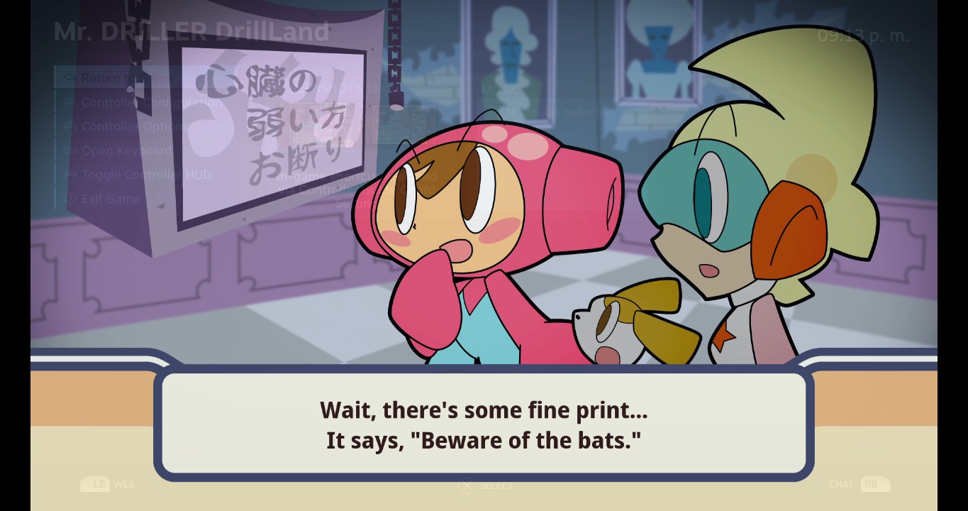 Mr. DRILLER DrillLand se enfoca en el protagonista, Susumu Hori, quien con sus amigos acude a un parque de diversiones que se enfoca en las atracciones de excavación (no me preguntes por qué). Y es ahí donde todo se vuelve más divertido y variado. A tu disposición tienes cinco atracciones, que si bien tienen como fundamento la misma jugabilidad, cada una de ellas tiene variaciones lo suficientemente importantes como para que sea única. Primero, tienes una atracción espacial, cuyo objetivo es que llegues al fondo de la mazmorra lo más pronto posible. Debido a que te encuentras fuera de la Tierra, cada segundo que pasa pierdes oxígeno, por lo que además de destruir bloques debes conseguir burbujas con el preciado elemento, que se encuentran regadas por la pantalla. También hay una atracción de casa embrujada, en la que debes conseguir botellas de agua bendita, líquido que después utilizas para echárselo a unos fantasmas y así poder atacarlos. Estos fantasmas, cuando son derrotados, te entregan unos diamantes; y para salir victorioso debes conseguir un puñado de ellos para poder avanzar. ¿Quieres algo más complejo? Entonces también hay una atracción con forma de RPG, en la que exploras una serie de mazmorras interconectadas, en las cuales debes buscar llaves para adentrarte más y más y así enfrentarte a un jefe final. Y así, hay más que te dejaré por descubrir.