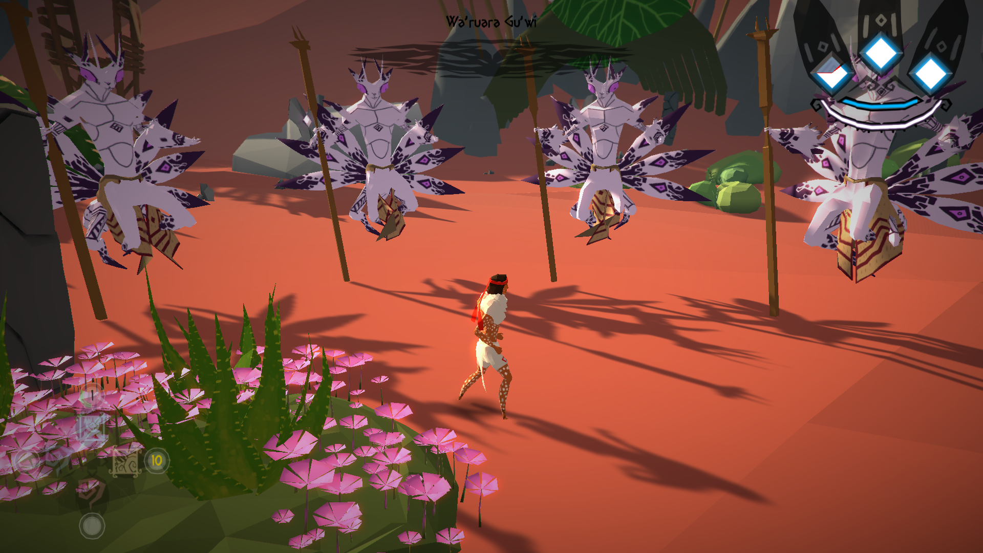 En cuanto a diseño de juego, sin embargo, Lienzo se saca un 10. El diseño de Mulaka, los semidioses, los jefes e incluso los enemigos fue cuidadosamente trabajado, al punto que hay un modo fotografía incluido para que puedas disfrutarlos en todo su esplendor. Aunque parezcan sencillos, los modelos 3D realmente reflejan la culutura, toponimia y mitología de la cultura y Sierra Tarahumara. Asimismo, cada una de las 7 regiones está llena de personalidad con una paleta de colores muy particular, diferentes habitantes y su propio tema musical, cada uno de los cuales captura perfectamente el espíritu prehispánico. Visualmente, Mulaka utiliza un estilo llamado «low-poly» (bajos polígonos), una técnica que permite ofrecer grandes vistas y personajes llamativos sin necesidad de ser hiperrealista. Personalmente, creo que este estilo es maravilloso, pero dado que inspira una idea retro, puede no ser del agrado de los puristas de los gráficos.