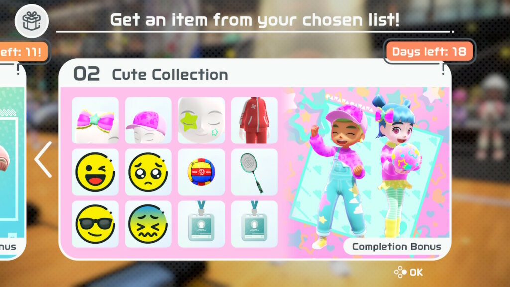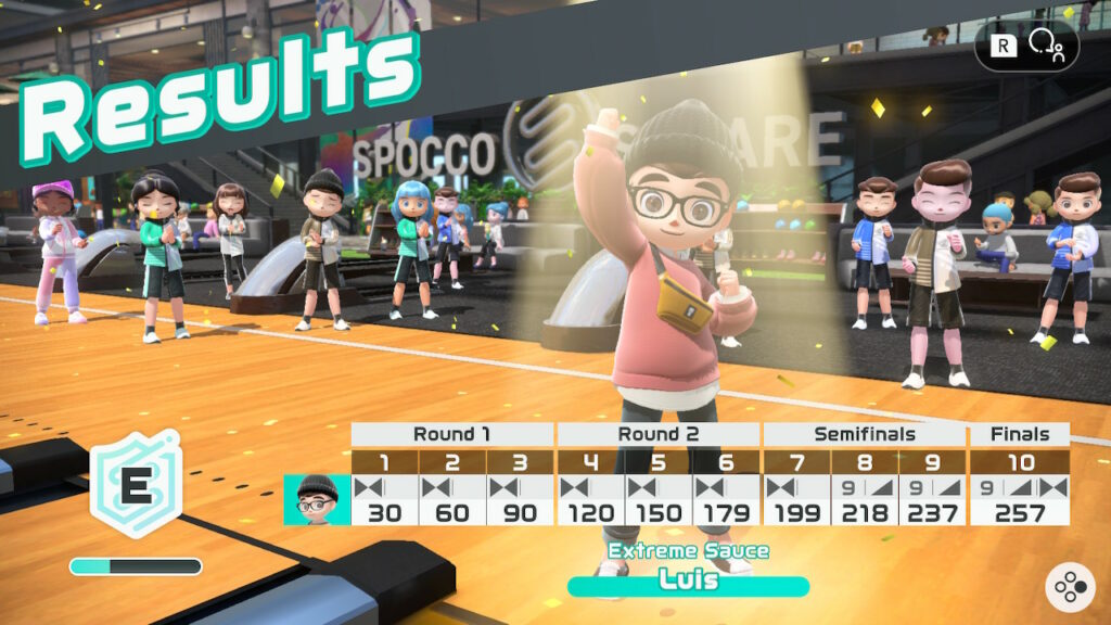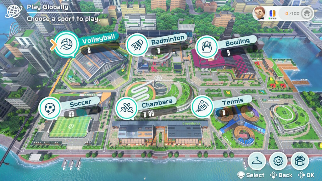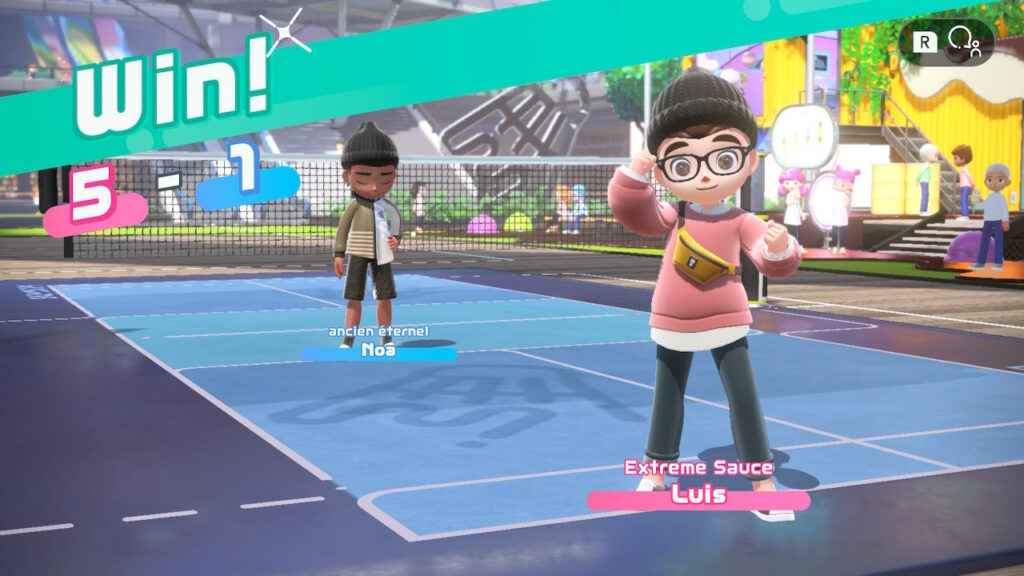 El avance en Nintendo Switch Sports se registra y observa en los puntos que obtenemos cuando jugamos en línea: una vez que logramos conseguir 100 puntos, los cuales se obtienen al jugar básicamente 3 partidas de cualquier deporte, podemos participar en una ruleta que premia con ropa, pegatinas o títulos para nuestro personaje. Estas ruletas funcionan de manera similar a una lotería, ya que al obtener todos los premios el juego nos otorga ropa y nuevas raquetas, espadas y equipo diverso para cambiar nuestro look mientras jugamos.
