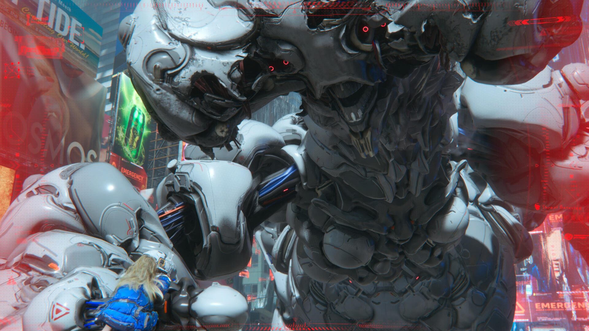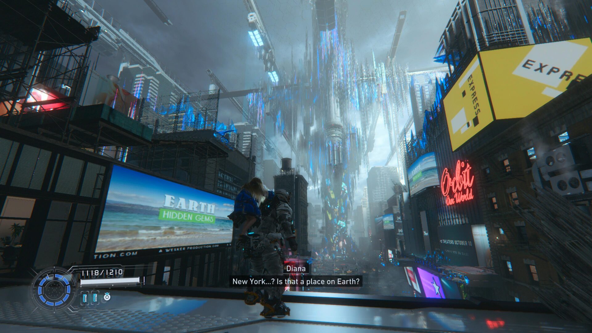 A pesar de lo que los tráilers hayan hecho parecer, PRAGMATA tiene una buena variedad de biomas que explorar en la base lunar, a pesar de que la campaña tiene una duración media. Sí, hay corredores corporativos llenos de blanco, pero también hay un terrario con árboles y plantas, un campo de minado en la superficie lunar, y hasta una réplica de Times Square en Nueva York. El diseño de arte es futurista y espectacular, el cual va muy bien acompañado con una calidad gráfica, diseño de assets y diseño de personajes tope de gama. No vemos mucho a Hugh porque está dentro de su traje la mayor parte del tiempo, pero Diana es adorable y expresiva, y los diseños de los enemigos son variados y extremadamente elaborados.