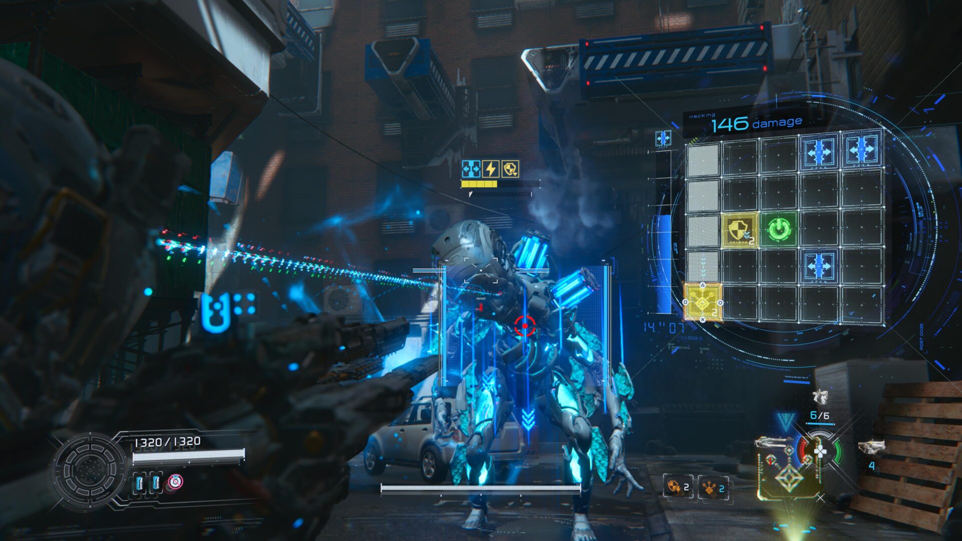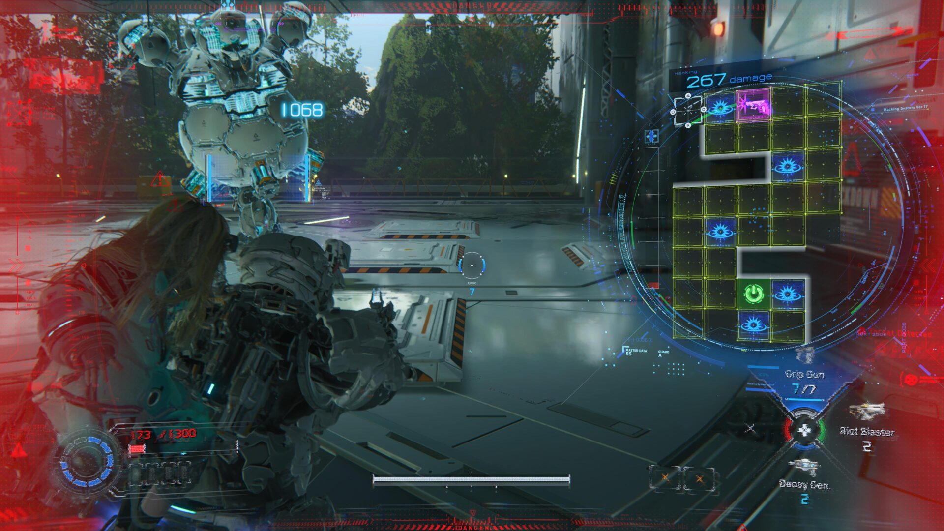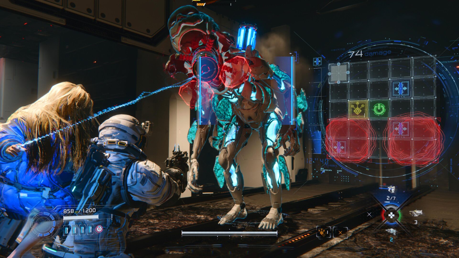 Uno podría pensar que esta mecánica se podría volver repetitiva, pero nada más alejado de la realidad. PRAGMATA se reinventa constantemente: todo el tiempo enfrentarás nuevos tipos de enemigos, con cuadrículas más grandes, diferentes puntos débiles, patrones de movimiento y particularidades. También irás desbloqueando una buena variedad de armas ofensivas, defensivas y de apoyo, cada una de las cuales sirve para un diferente propósito. Hay algunas habilidades para Hugh, varios tipos de hacks para que Diana use en la cuadrícula; y hasta una treintena de mods que modifican las habilidades de Hugh en combate. El resultado es un sistema de combate hiper flexible que te permite hacer diferentes builds dependiendo de tus objetivos y manera de jugar.