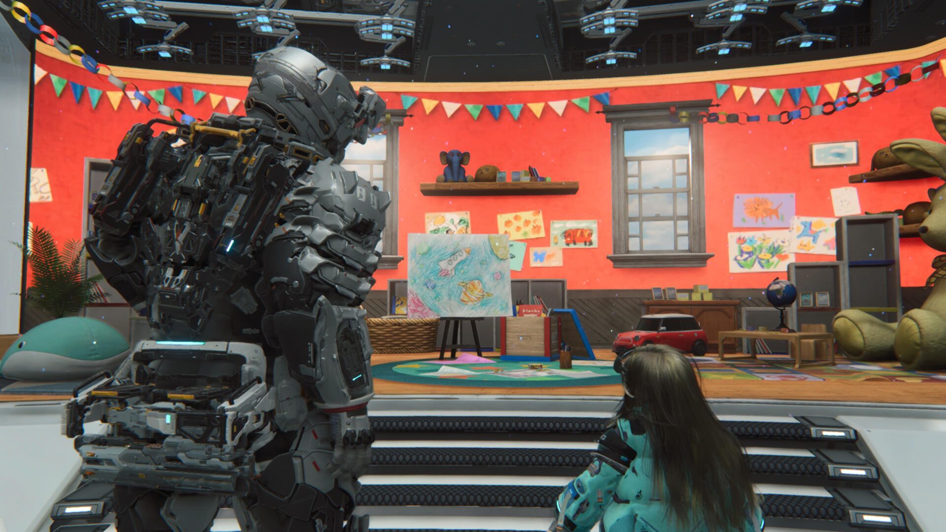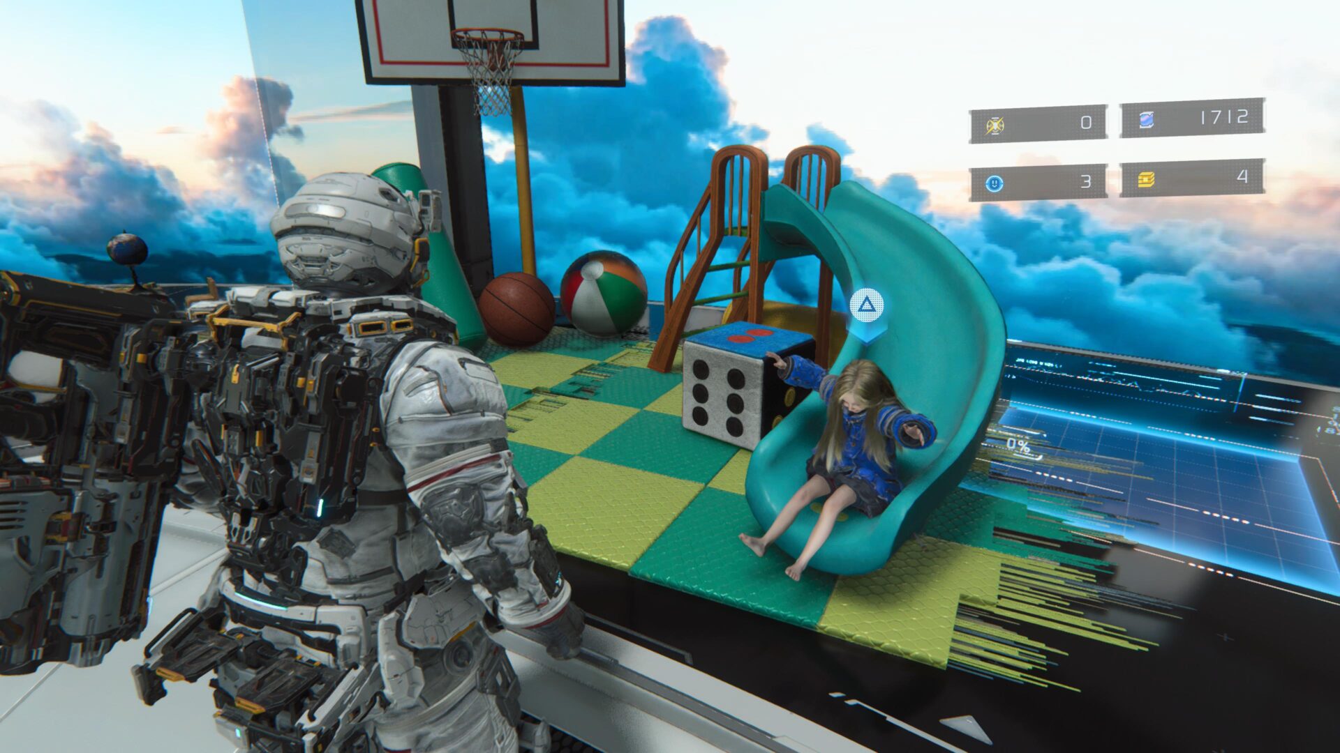 En temas de exploración, PRAGMATA es un juego lineal basado en niveles. Tu base de operaciones es un refugio, en donde mejorarás tus habilidades, armas y hacks; pero también podrás cambiarte de traje, jugar a desbloquear mods y hacks en un minijuego de bingo; jugar misiones de entrenamiento con recompensas; y hasta leer contenido narrativo adicional. Aunque siendo sincero, lo mejor del refugio es interactuar con Diana, pues puedes tener conversaciones con ella o regalarle cosas que encuentras en el mundo; y verla conocer y aprender todo lo que un niño hace: desde un kit para hacer castillos de arena, hasta una resbaladilla, una pistola de agua o una caja de crayones. ¡Incluso puedes jugar a las escondidas con ella! Nuevamente, ver a Diana disfrutar de todos estos regalos y maravillarse como una verdadera niña te derrite el corazón.