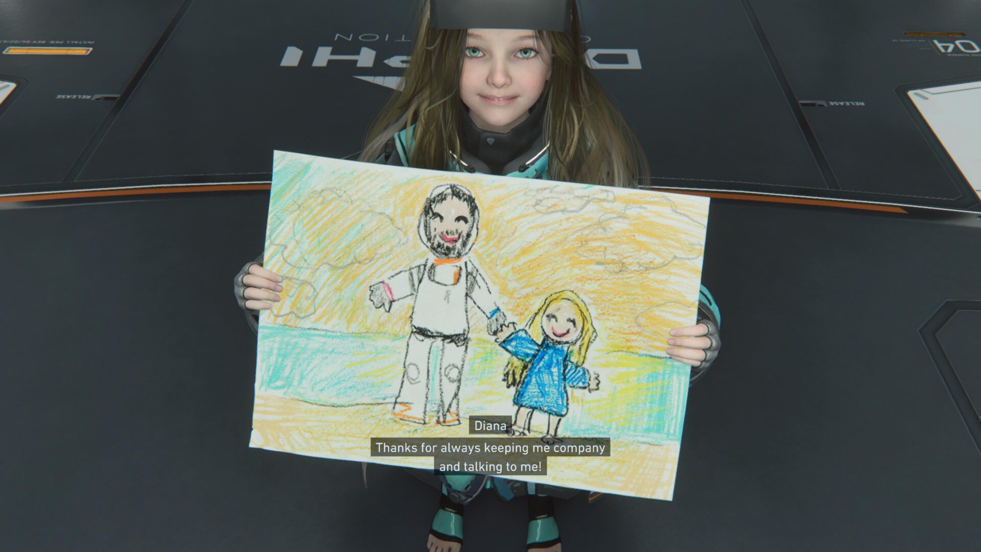 La verdadera magia aquí está entre la relación entre Hugh y Diana, que es verdaderamente adorable y sí que derrite el corazón. La gente dice que PRAGMATA es un simulador de padre, y la verdad es bastante apropiado. La manera en que los protagonistas hablan e interactúan, en el campo o en su refugio, los regalos que Hugh encuentra y regala a Diana, o los dibujos que ella le hace a él, son el verdadero hilo que te impulsa a seguir jugando. Eventualmente, el objetivo se vuelve sentimentalmente claro: proteger a Diana a toda costa.