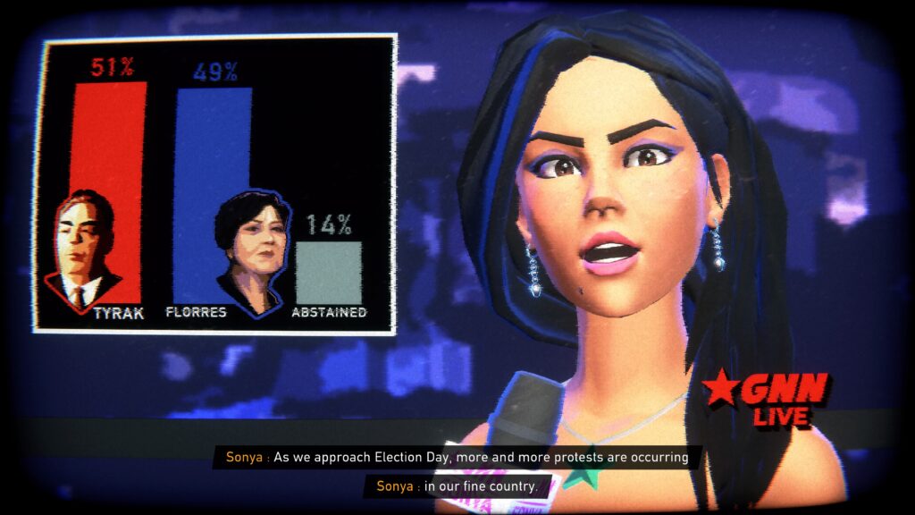 Además de todo lo mencionado anteriormente, cada uno de estos escenarios te permite conocer a uno de 7 personajes que son quienes conectan toda la narrativa de Road 96. A lo largo de tus viajes te encontrarás con una chica que también intenta escapar, un taxista terrorífico, una reportera millonaria y otros; que aunque en principio parecen no tener nada que ver, ligan la narrativa principal de una manera brillante. Con cada nuevo escenario y cada nuevo encuentro, conoces un poco más a cada uno de estos personajes y un paso a la vez empiezas a deducir sus relaciones y a desenmarañar la historia de Road 96. Por cierto, algunos de estos personajes son netamente agradables o, al menos, tienen motivaciones comprensibles detrás. Lo que al inicio parece un simple juego de escape, poco a poco se va a convirtiendo en un título lleno de conspiraciones, asesinatos, misterio y emociones; y, con tus conocimientos, deberás tomar una decisión final para el futuro de Petria.