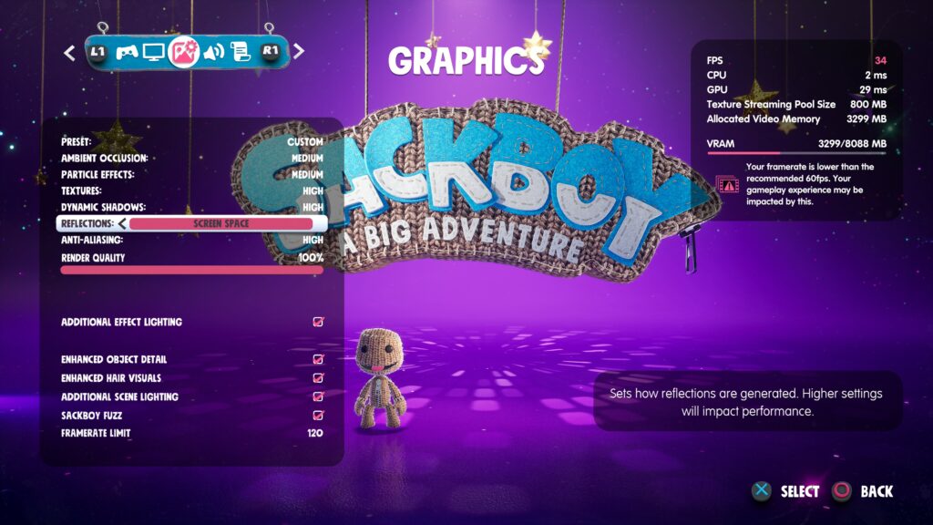 Ahora bien, una cosa es lo que dice el papel y otra muy diferente lo que dicta la práctica. Y en ese sentido, aunque la fidelidad visual es bastante alta y el ray-tracing está implementado de gran manera, me pesa informarte que Sackboy: A Big Aventure no está precisamente bien optimizado, y de hecho tiene problemas de desempeño.