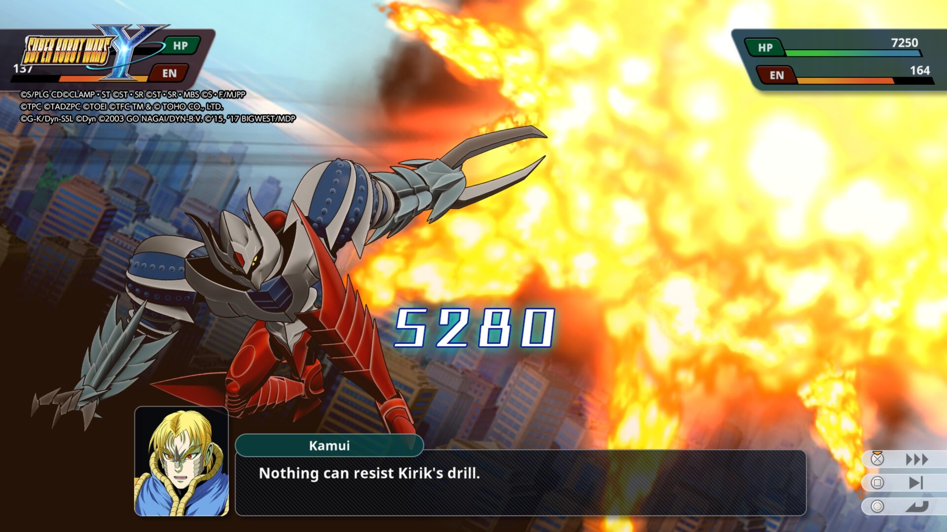 Estos condimentos narrativos añadidos; junto con un mejor guion, diálogos más entretenidos y naturales entre personajes, y la absurda pero divertida premisa de la ciudad flotante; permiten que Super Robot Wars Y ofrezca mucho más que un simple sistema de combate vistoso.