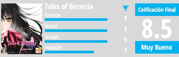 En conclusión, podemos decir que Tales of Berseria es un título impecable en cada uno de sus elementos que lo conforman. La historia es excelente, los personajes cautivadores, y sus valores técnicos satisfactorios. Desgraciadamente aún hay aspectos que no terminan de ser mejorados lo suficiente como una mayor innovación en su jugabilidad, problemas con la cámara y un desplazamiento un poco tortuoso, aspectos que impiden que el título sea convierta en un imprescindible del género pero que asegura su ya de por sí alta calidad.