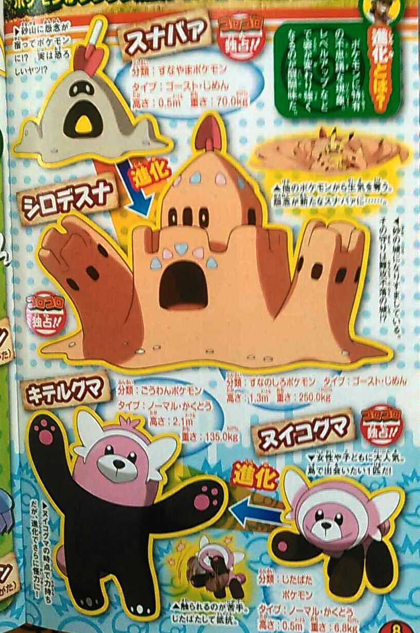 Pero eso no es todo, también dispondremos de dos pokémon basados en castillos de arena, Sunabaa y Sunadeshiro; ambos son tipo Fantasma/Tierra. La pre evolución de Bewear se llama Nuikoguma y es tipo Normal/Lucha.