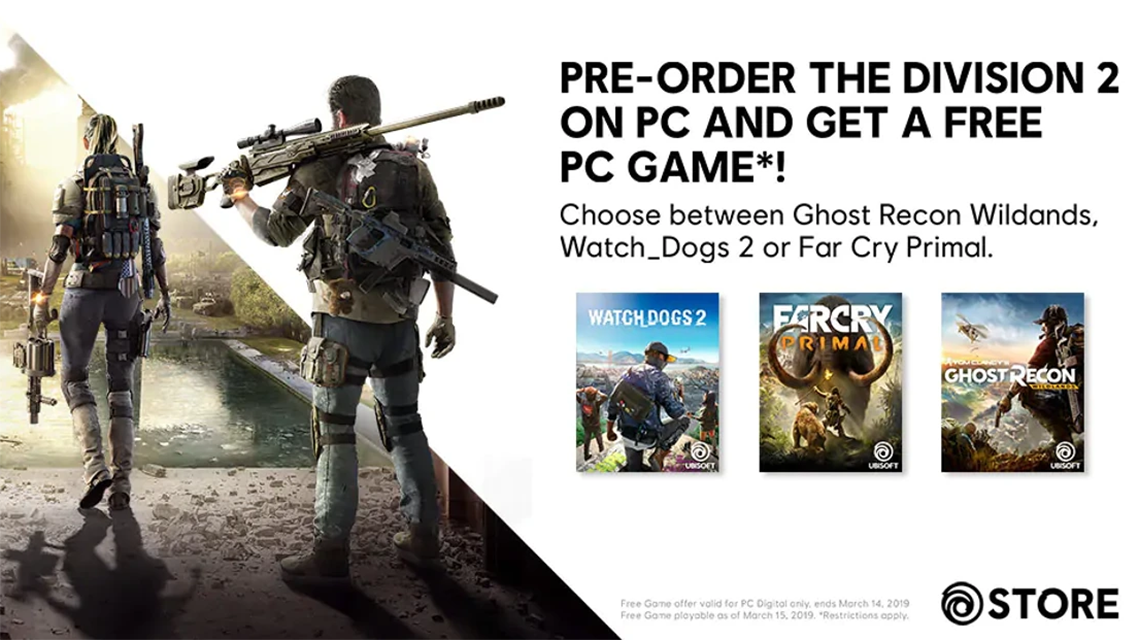 A través de un comunicado, Ubisoft anunció que los jugadores que pre-ordenen la versión digital de PC de Tom Clancy’s The Division antes del 14 de marzo de 2019 recibirán una copia gratis de la edición digital estándar que ellos elijan de cualquiera de los siguientes títulos aclamados del portafolio de Ubisoft:  Watch Dogs 2Tom Clancy’s Ghost Recon Wildlands o Far Cry Primal. Los usuarios podrán pre-ordenar la versión digital de Tom Clancy’s The Division en www.epicgames.com/store o https://store.ubi.com.