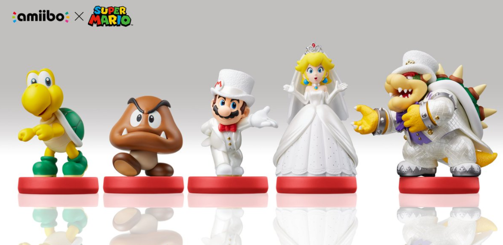 Con temática de boda Mario, Peach y Bowser, son tres de las nuevas figuras disponibles. Dichos personajes deben su vestimenta al conflicto que deberá enfrentar la Princesa al estar a punto de ser obligada a contraer nupcias con el rival de Mario, seguramente tendrán algún tipo de reacción especial al colocarse con Switch y Odyssey.
